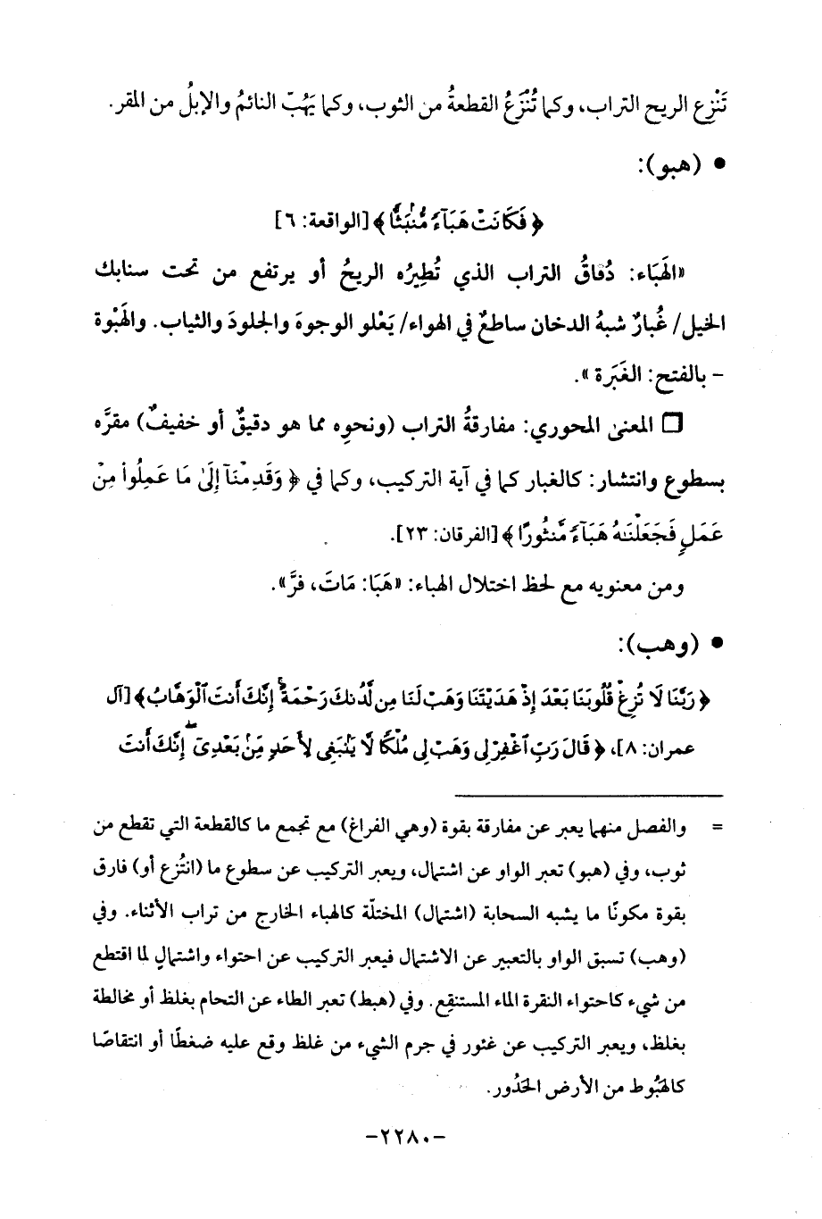 = والفصل منهما يعبر عن مفارقة بقوة (وهي الفراغ) مع تجمع ما كالقطعة التي تقطع من ثوب، وفي (هبو) تعبر الواو عن اشتمال، ويعبر التركيب عن سطوع ما (انتُزع أو) فارق بقوة مكونًا ما يشبه السحابة (اشتمال) المختلّة كالهباء الخارج من تراب الأثناء. وفي (وهب) تسبق الواو بالتعبير عن الاشتمال فيعبر التركيب عن احتواء واشتمال لما اقتطع من شيء كاحتواء النقرة الماء المستنقِع. وفي (هبط) تعبر الطاء عن التحام بغلظ أو مخالطة بغلظ، ويعبر التركيب عن غئور في جرم الشيء من غلظ وقع عليه ضغطًا أو انتقاصًا كالهَبُوط من الأرض الحَدُور.