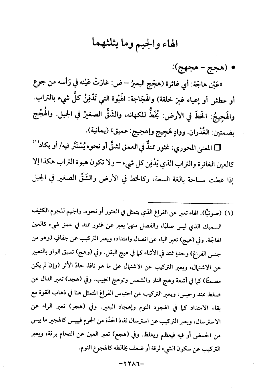 (¬1) (صوتيًّا): الهاء تعبر عن الفراغ الذي تمثل في الغئور أو نحوه. والجيم للجرم الكثيف السميك الذي ليس صلبًا، والفصل منهما يعبر عن غئور ممتد في عمق شيء كالعين الهاجّة. وفي (هيج) تعبر الياء عن اتصال وامتداد، ويعبر التركيب عن جفافٍ (وهو من جنس الفراغ) وحدةٍ تمتد في الأثناء كما في هيج البقل. وفي (وهج) تسبق الواو بالتعبير عن الاشتمال، ويعبر التركيب عن الاشتمال على ما هو نافذ حادّ الأثر (وإن لم يكن مصمتًا) كما في أشعة وهج النار والشمس وتوهج الطِيب. وفي (هجد) تعبر الدال عن ضغط ممتد وحبس، ويعبر التركيب عن احتباس الفراغ المتمثل هنا في ذهاب القوة مع بقاء الامتداد كما في الهجود النوم وإهجاد البعير. وفي (هجر) تعبر الراء عن الاسترسال، ويعبر التركيب عن استرسال نفاذ الحدّة من الجرم فييبس كالهجير ما يبس من الحمض أو فيه فيعظم ويغلظ. وفي (هجع) تعبر العين عن التحام برقة، ويعبر التركيب عن سكون الشيء لرقة أو ضعف يخالطه كالهجوع النوم.