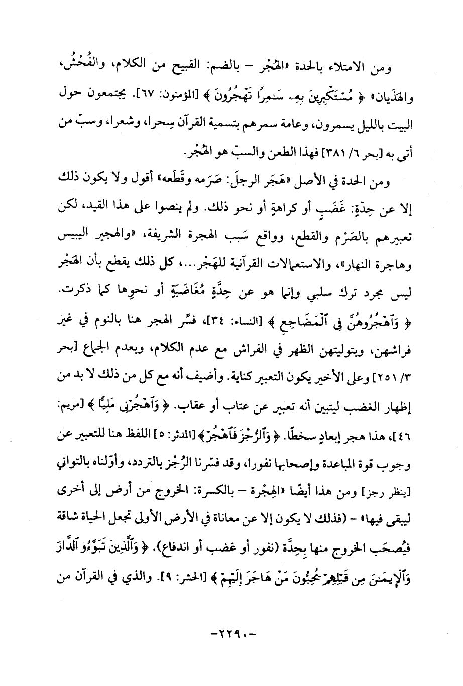 ومن الحدة في الأصل "هَجَر الرجلَ: صَرَمه وقَطَعه "أقول ولا يكون ذلك إلا عن حِدّةٍ: غَضَبٍ أو كراهةٍ أو نحو ذلك. ولم ينصوا على هذا القيد، لكن تعبيرهم بالصَرم والقطع، وواقع سَبب الهجرة الشريفة، "والهجير اليبيس وهاجرة النهار "، والاستعمالات القرآنية للهَجر ... ، كل ذلك يقطع بأن الهجر ليس مجرد ترك سلبي وإنما هو عن حِدَّةٍ مُغَاضَبةٍ أو نحوها كما ذكرت. {وَاهْجُرُوهُنَّ فِي الْمَضَاجِعِ} [النساء: 34]، فسِّر الهجر هنا بالنوم في غير فراشهن، وبتوليتهن الظهر في الفراش مع عدم الكلام، وبعدم الجماع [بحر 3/ 251] وعلى الأخير يكون التعبير كناية. وأضيف أنه مع كل من ذلك لا بد من إظهار الغضب ليتبين أنه تعبير عن عتاب أو عقاب. {وَاهْجُرْنِي مَلِيًّا} [مريم: 46]، هذا هجر إبعادٍ سخطًا. {وَالرُّجْزَ فَاهْجُرْ (5)} [المدثر: 5] اللفظ هنا للتعبير عن وجوب قوة المباعدة وإصحابها نفورا، وقد فسّرنا الرُجْز بالتردد، وأوّلناه بالتواني [ينظر رجز] ومن هذا أيضًا "الِهجرة- بالكسرة: الخروج عن أرض إلى أخرى ليبقى فيها "- (فذلك لا يكون إلا عن معاناة في الأرض الأولى تجعل الحياة شاقة فيُصحَب الخروج منها بِحِدَّة (نفور أو غضب أو اندفاع). {وَالَّذِينَ تَبَوَّءُوا الدَّارَ وَالْإِيمَانَ مِنْ قَبْلِهِمْ يُحِبُّونَ مَنْ هَاجَرَ إِلَيهِمْ} [الحشر: 9]. والذي في القرآن من