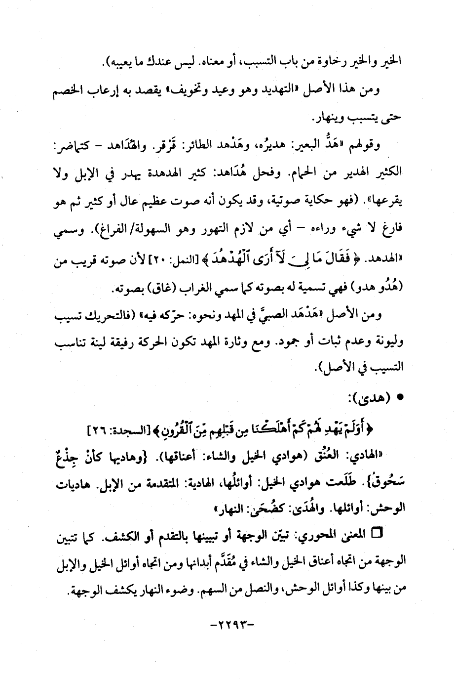 "الهادي: العُنُق (هوادي الخيل والشاء: أعناقها). {وهاديها كأن جِذعٌ سحُوق}. طَلَعت هوادي الخيل: أوائلُها، الهاديه: المتقدمة من الإبل. هاديات الوحش: أوائلها. والهدَى: كضحَى: النهار ".