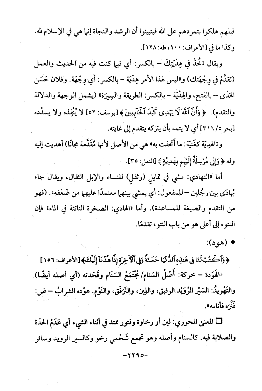 أما "التهادي: مثي في تمايلٍ (وثقلٍ) لنساء والإبل الثقال، ويقال جاء يُهادَى بين رجُلين- للمفعول: أي يمشي بينهما معتمدًا عليهما من ضَعْفه ". (فهو من التقدم والصيغة للمساعدة). وأما "الهادي: الصخرة الناتئة في الماء "فإن النتوء إلى أعلى هو من باب النتوء تقدمًا.