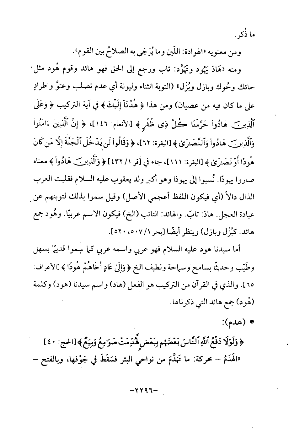 ومنه "هَادَ يَهُود وتهَوَّد: تاب ورجع إلى الحق فهو هائد وقوم هُود مثل حائك وحُوك وبازل وبُزْل " (التوبة انثناء وليونة أي عدم تصلب وعتوٍّ واطرادٍ على ما كان فيه من عصيان) ومن هذا {هُدْنَا إِلَيكَ} في آية التركيب {وَعَلَى الَّذِينَ هَادُوا حَرَّمْنَا كُلَّ ذِي ظُفُرٍ} [الأنعام: 146]، {إِنَّ الَّذِينَ آمَنُوا وَالَّذِينَ هَادُوا وَالنَّصَارَى} [البقرة: 62]، {وَقَالُوا لَنْ يَدْخُلَ الْجَنَّةَ إلا مَنْ كَانَ هُودًا أَوْ نَصَارَى} [البقرة: 111] , جاء في [قر 1/ 432] {وَالَّذِينَ هَادُوا} معناه صاروا يهودًا. نُسبوا إلى يهوذا وهو أكبر ولد يعقوب - عليه السلام - فقلبت العرب الذال دالًا (أي فيكون اللفظ أعجمي الأصل) وقيل سموا بذلك لتوبتهم عن عبادة العجل. هادَ: تابَ. والهائد: التائب (الخ) فيكون الاسم عربيًّا. وهُود جمع هائد. كبُزْل وبازل) وينظر أيضًا [بحر 1/ 507, 520].
