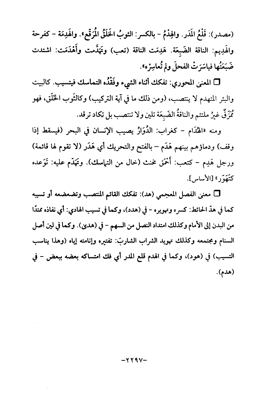 ° معنى الفصل المعجمي (هد): تفكك القائم المنتصب وتضعضعه أو تسيبه كما في هدّ الحائط: كسره وتهويره- في (هدد)، وكما في تسيب الهادي: أي نفاذه ممتدًا من البدن إلى الإمام وكذلك امتداد النصل من السهم- في (هدى). وكما في لين أصل السنام ومجتمعه وكذلك تهويد الثراب الشاربَ: تفتيره وإنامته إياه (وهذا يناسب النسيب) في (هود)، وكما في الهدم قلع المدر أي فك امتساكه بعضه ببعض- في (هدم).