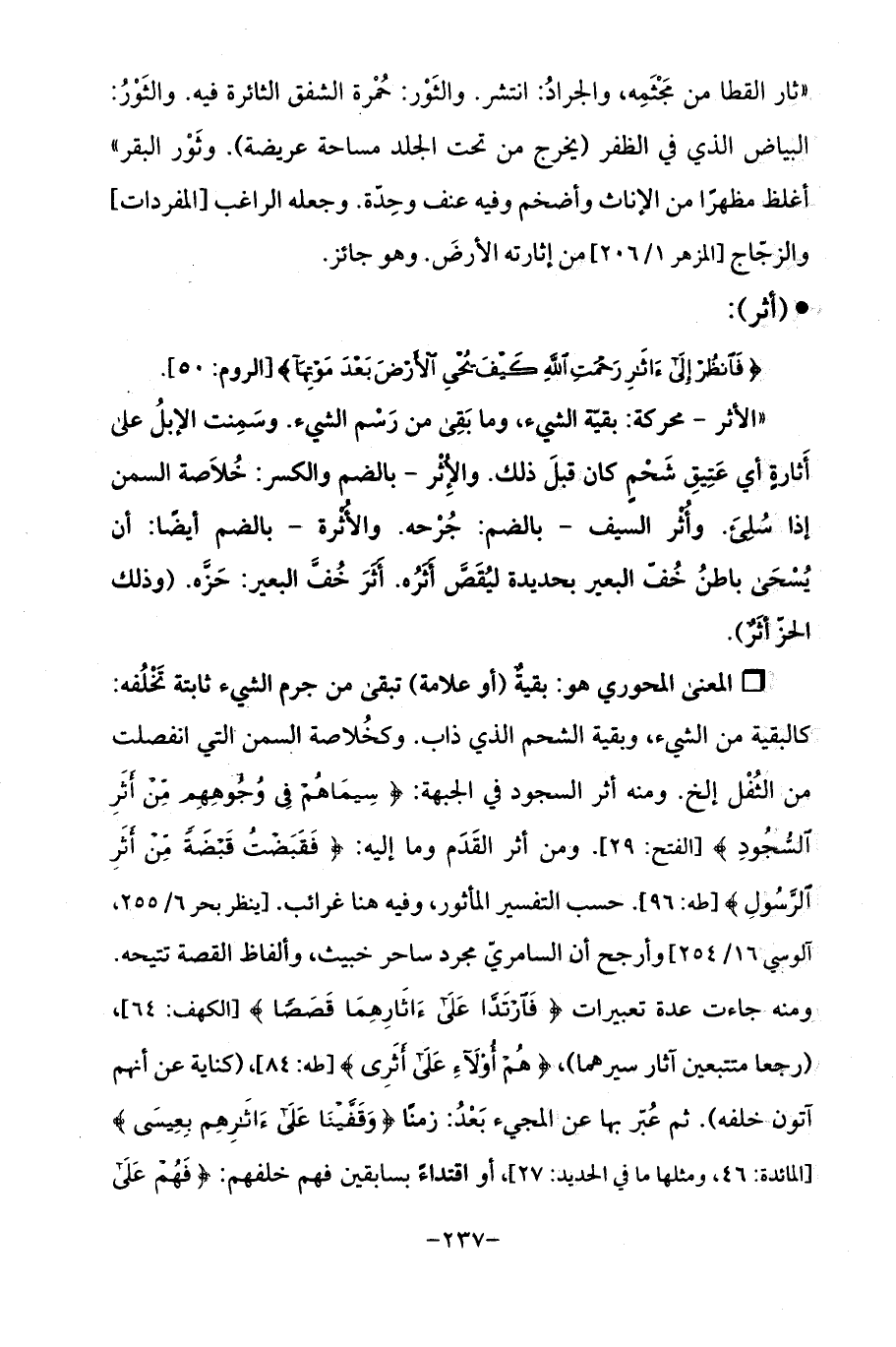 Qهو: بقيةٌ (أو علامة) تبقى من جرم الشيء ثابتة تَخْلُفه: كالبقية من الشيء، وبقية الشحم الذي ذاب. وكخُلاصة السمن التي انفصلت من الثُفْل إلخ. ومنه أثر السجود في الجبهة: {سِيمَاهُمْ فِي وُجُوهِهِمْ مِنْ أَثَرِ السُّجُودِ} [الفتح: 29]. ومن أثر القَدَم وما إليه: {فَقَبَضْتُ قَبْضَةً مِنْ أَثَرِ الرَّسُولِ} [طه: 96]. حسب المسير المأثور، وفيه هنا غرائب. [ينظر بحر 6/ 255، آلوسي 16/ 254] وأرجح أن السامريّ مجرد ساحر خبيث، وألفاظ القصة تتيحه. ومنه جاءت عدة تعبيرات {فَارْتَدَّا عَلَى آثَارِهِمَا قَصَصًا} [الكهف: 64]، (رجعا متتبعين آثار سيرهما)، {هُمْ أُولَاءِ عَلَى أَثَرِي} [طه: 84]، (كناية عن أنهم آتون خلفه). ثم عُبّر بها عن المجيء بَعْدُ: زمنًا {وَقَفَّيْنَا عَلَى آثَارِهِمْ بِعِيسَى} [المائدة: 46, ومثلها ما في الحديد: 27] , أو اقتداءً بسابقين فهم خلفهم: {فَهُمْ عَلَى