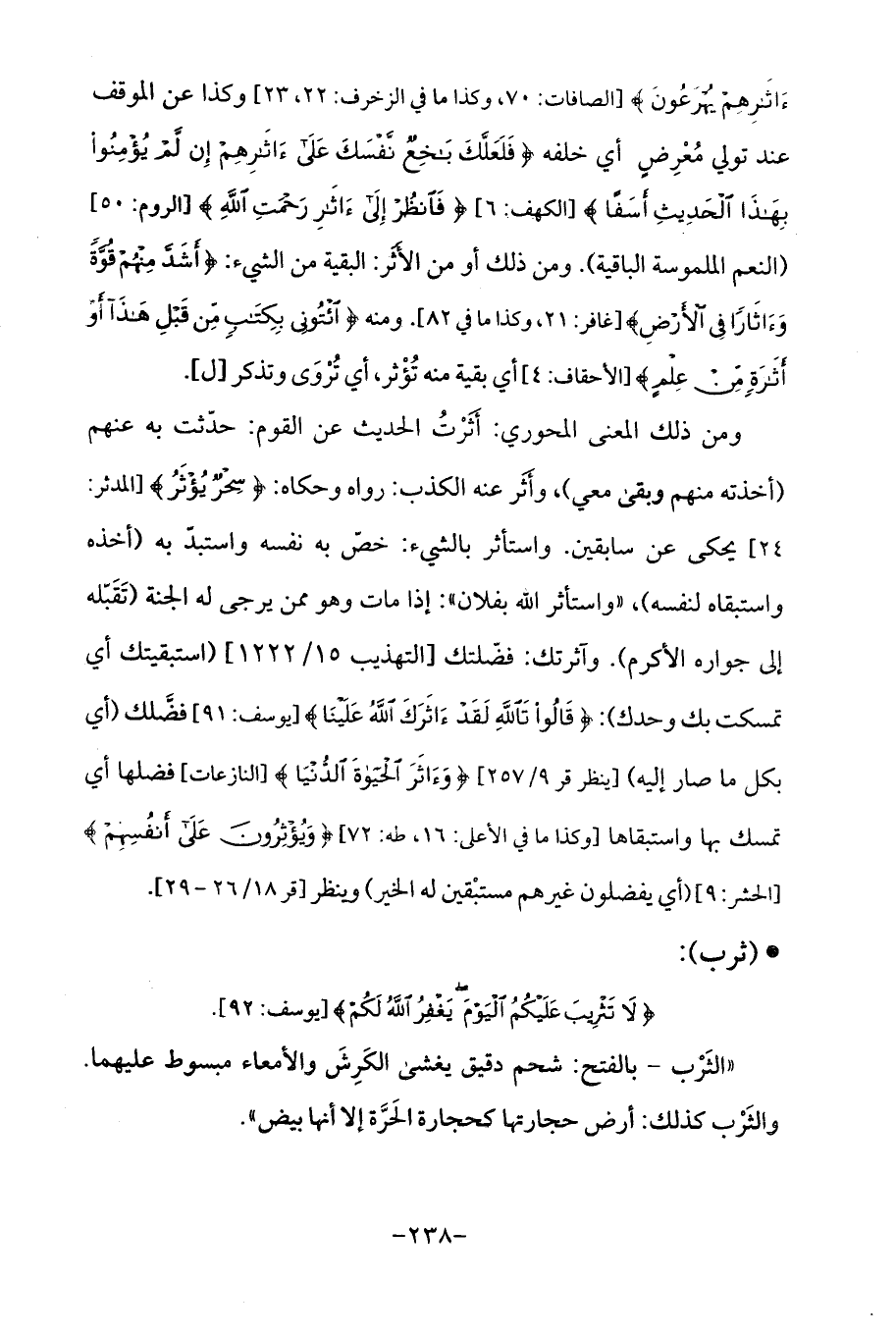 آثَارِهِمْ يُهْرَعُونَ} [الصافات: 70، وكذا ما في الزخرف: 22، 23] وكذا عن الموقف عند تولي مُعْرِضٍ أي خلفه {فَلَعَلَّكَ بَاخِعٌ نَفْسَكَ عَلَى آثَارِهِمْ إِنْ لَمْ يُؤْمِنُوا بِهَذَا الْحَدِيثِ أَسَفًا} [الكهف: 6] {فَانْظُرْ إِلَى آثَارِ رَحْمَتِ اللَّهِ} [الروم: 50] (النعم الملموسة الباقية). ومن ذلك أو من الأَثَر: البقية من الشيء: {أَشَدَّ مِنْهُمْ قُوَّةً وَآثَارًا فِي الْأَرْضِ} [غافر: 21, وكذا ما في 82]. ومنه {ائْتُونِي بِكِتَابٍ مِنْ قَبْلِ هَذَا أَوْ أَثَارَةٍ مِنْ عِلْمٍ} [الأحقاف: 4] أي بقية منه تُؤْثر، أي تُرْوَى وتذكر [ل].