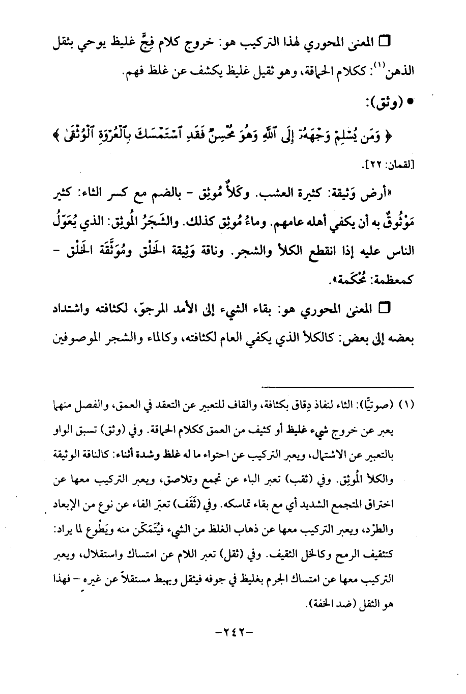 (¬1) (صوتيًّا): الثاء لنفاذ دِقاق بكثافة، والقاف للتعبير عن التعقد في العمق، والفصل منهما يعبر عن خروج شيء غليظ أو كثيف من العمق ككلام الحماقة. وفي (وثق) تسبق الواو بالتعبير عن الاشتمال، ويعبر التركيب عن احتواء ما له غلظ وشدة أثناء: كالناقة الوثيقة والكلأُ المُوثِق. وفي (ثقب) تعبر الماء عن تجمع وتلاصق، ويعبر التركيب معها عن اختراق المتجمع الشديد أي مع بقاء تماسكه. وفي (ثَقَف) تعبّر الفاء عن نوع من الإبعاد والطرْد، ويعبر التركيب معها عن ذهاب الغلظ من الشيء فيُتَمَكّن منه ويَطْوع لما يراد: كتثقيف الرمح وكالخل الثقيف. وفي (ثقل) تعبر اللام عن امتساك واستقلال، ويعبر التركيب معها عن امتساك الجرم بغليظ في جوفه فيثقل ويهبط مستقلًا عن غيره - فهذا هو الثقل (ضد الخفة).