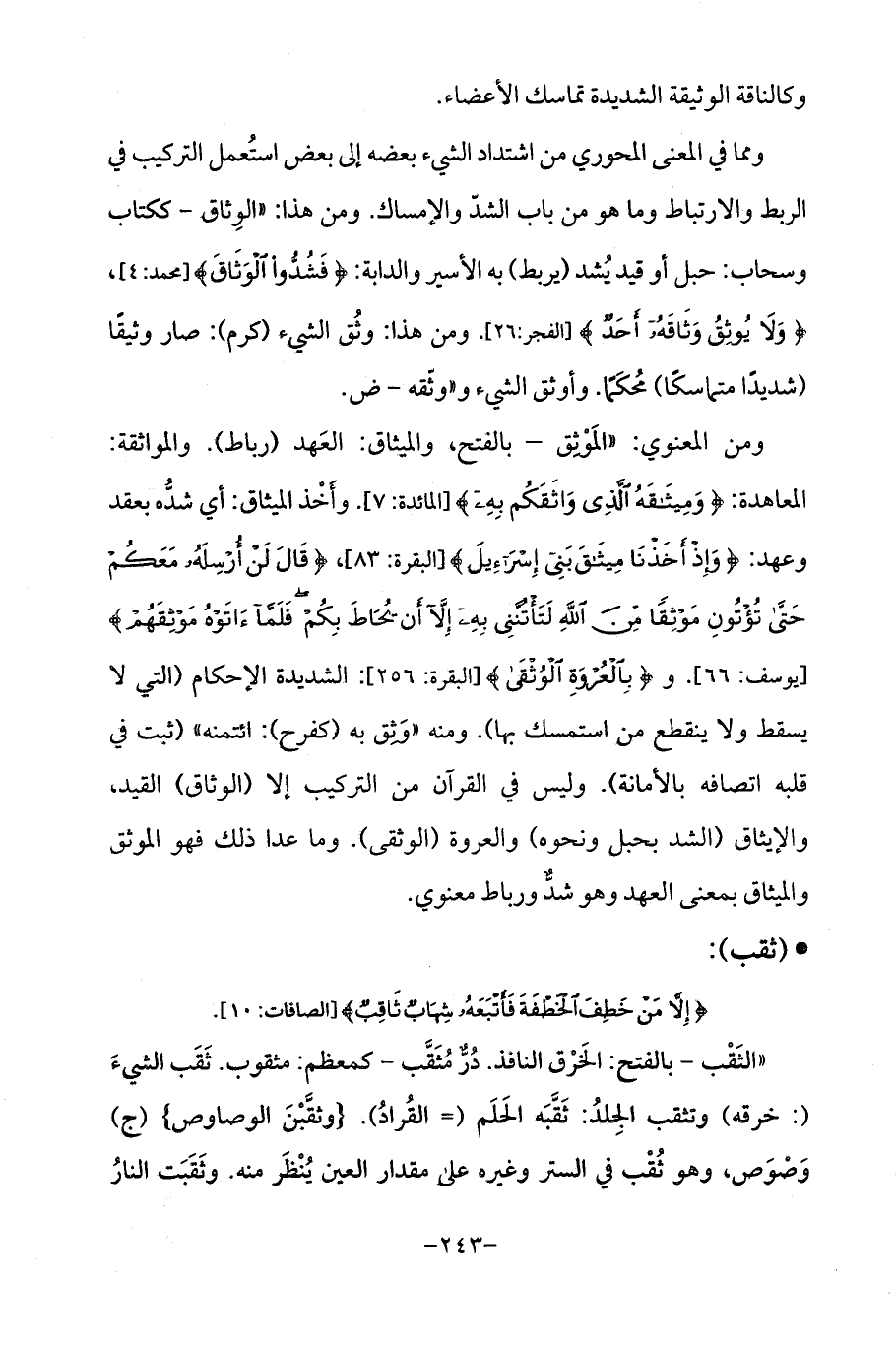 ومن المعنوي: "المَوْثِق - بالفتح، والميثاق: العَهد (رباط). والمواثقة: المعاهدة: {وَمِيثَاقَهُ الَّذِي وَاثَقَكُمْ بِهِ} [المائدة: 7]. وأَخْذ الميثاق: أي شدُّه بعقد وعهد: {وَإِذْ أَخَذْنَا مِيثَاقَ بَنِي إِسْرَائِيلَ} [البقرة: 83]، {قَالَ لَنْ أُرْسِلَهُ مَعَكُمْ حَتَّى تُؤْتُونِ مَوْثِقًا مِنَ اللَّهِ لَتَأْتُنَّنِي بِهِ إِلَّا أَنْ يُحَاطَ بِكُمْ فَلَمَّا آتَوْهُ مَوْثِقَهُمْ} [يوسف: 66]. و {بِالْعُرْوَةِ الْوُثْقَى} [البقرة: 256]: الشديدة الإحكام (التي لا يسقط ولا ينقطع من استمسك بها). ومنه "وَثِق به (كفرح): ائتمنه " (ثبت في قلبه اتصافه بالأمانة). وليس في القرآن من التركيب إلا (الوثاق) القيد، والإيثاق (الشد بحبل ونحوه) والعروة (الوثقى). وما عدا ذلك فهو الموثق والميثاق بمعنى العهد وهو شدٌّ ورباط معنوي.