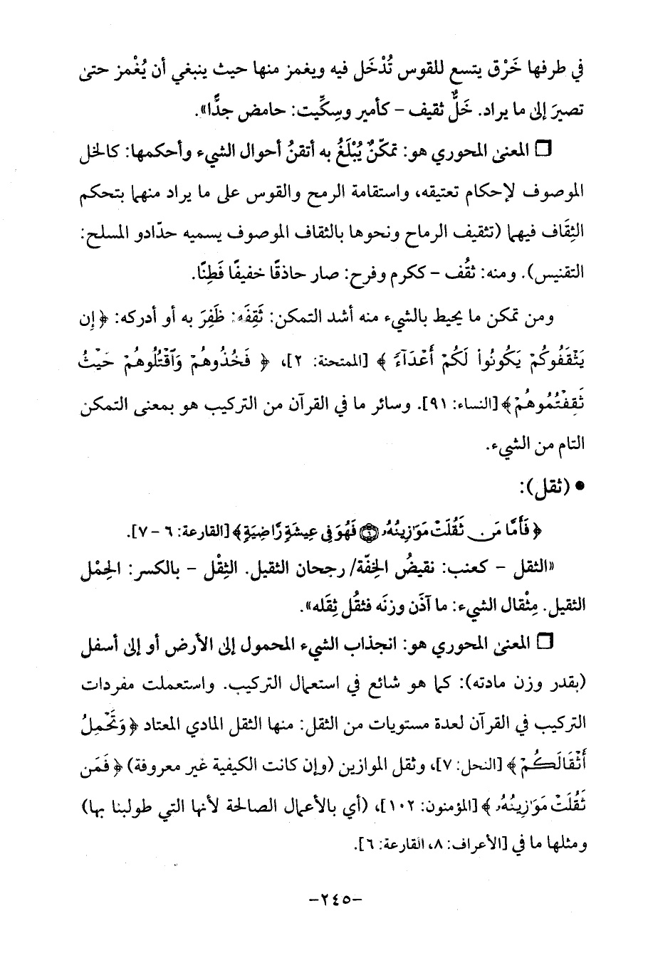 Qهو: انجذاب الشيء المحمول إلى الأرض أو إلى أسفل (بقدر وزن مادته): كما هو شائع في استعمال التركيب. واستعملت مفردات التركيب في القرآن لعدة مستويات من الثقل: منها الثقل المادي المعتاد {وَتَحْمِلُ أَثْقَالَكُمْ} [النحل: 7]، وثقل الموازين (وإن كانت الكيفية غير معروفة) {فَمَنْ ثَقُلَتْ مَوَازِينُهُ} [المؤمنون: 102]، (أي بالأعمال الصالحة لأنها التي طولبنا بها) ومثلها ما في [الأعراف: 8، القارعة: 6].