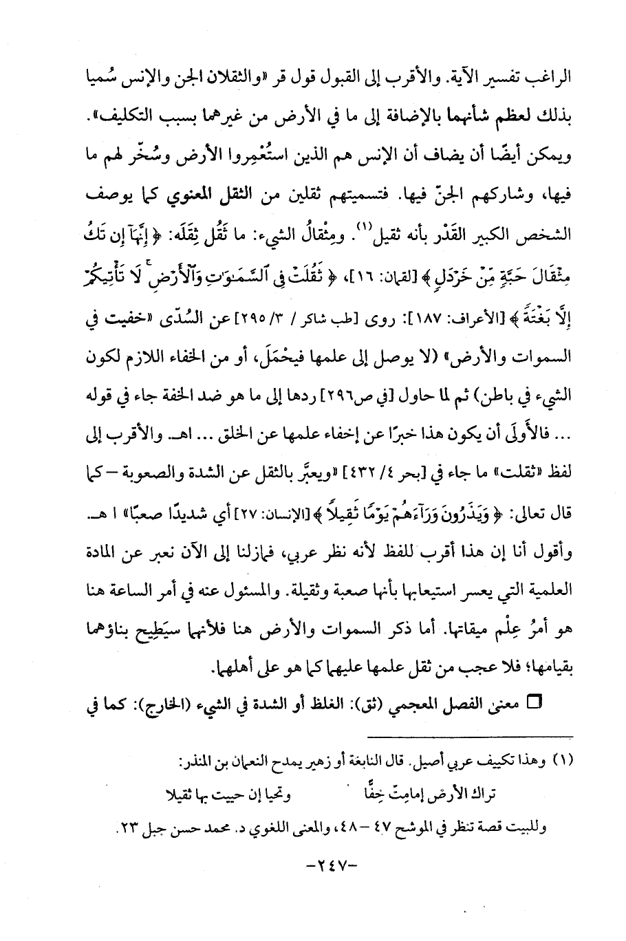 الراغب تفسير الآية. والأقرب إلى القبول قول قر "والثقلان الجن والإنس سُميا بذلك لعظم شأنهما بالإضافة إلى ما في الأرض من غيرهما بسبب التكليف ". ويمكن أيضًا أن يضاف أن الإنس هم الذين استُعْمِروا الأرض وسُخّر لهم ما فيها، وشاركهم الجنّ فيها. فتسميتهم ثقلين من الثقل المعنوي كما يوصف الشخص الكبير القَدْر بأنه ثقيل (¬1). ومِثْقالُ الشيء: ما ثَقُل ثِقَلَه: {إِنَّهَا إِنْ تَكُ مِثْقَالَ حَبَّةٍ مِنْ خَرْدَلٍ} [لقمان: 16]، {ثَقُلَتْ فِي السَّمَاوَاتِ وَالْأَرْضِ لَا تَأْتِيكُمْ إِلَّا بَغْتَةً} [الأعراف: 187]: روى [طب شاكر/ 3/ 295] عن السُدّى "خفيت في السموات والأرض " (لا يوصل إلى علمها فيحْمَلَ، أو من الخفاء اللازم لكون الشيء في باطن) ثم لما حاول [في ص 296] ردها إلى ما هو ضد الخفة جاء في قوله ... فالأَولَى أن يكون هذا خبرًا عن إخفاء علمها عن الخلق ... اهـ. والأقرب إلى لفظ "ثقلت "ما جاء في [بحر 4/ 432] "ويعبَّر بالثقل عن الشدة والصعوبة - كما قال تعالى: {وَيَذَرُونَ وَرَاءَهُمْ يَوْمًا ثَقِيلًا} [الإنسان: 27] أي شديدًا صعبًا "اهـ. وأقول أنا إن هذا أقرب "للفظ لأنه نظر عربي، فما زلنا إلى الآن نعبر عن المادة العلمية التي يعسر استيعابها بأنها صعبة وثقيلة. والمسئول عنه في أمر الساعة هنا هو أمرُ عِلْم ميقاتها. أما ذكر السموات والأرض هنا فلأنهما سيَطِيح بناؤهما بقيامها؛ فلا عجب من ثقل علمها عليهما كما هو على أهلهما.