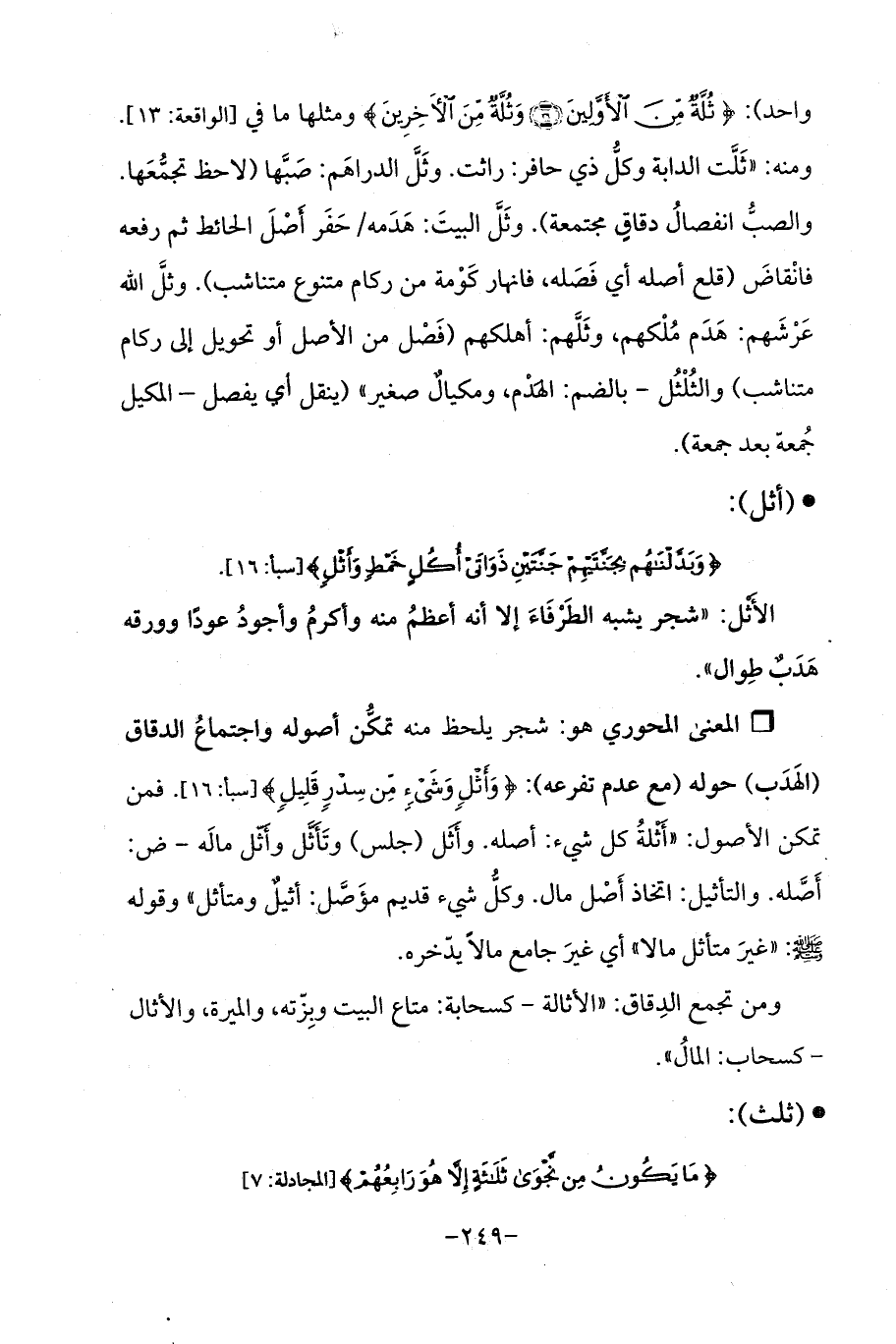 واحد): {ثُلَّةٌ مِنَ الْأَوَّلِينَ (13) وَقَلِيلٌ مِنَ الْآخِرِينَ} ومثلها ما في [الواقعة: 13]. ومنه: "ثَلَّت الدابة وكلُّ ذي حافر: راثت. وثَلَّ الدراهَم: صَبَّها (لاحظ تجمُّعَها. والصبُّ انفصالُ دقاقٍ مجتمعة). وثَلَّ البيتَ: هَدَمه/ حَفَر أَصْلَ الحائط ثم رفعه فانْقاضَ (قلع أصله أي فَصَله، فانهار كَوْمة من ركام متنوع متناشب). وثلَّ الله عَرْشَهم: هَدَم مُلْكهم، وثَلَّهم: أهلكهم (فَصْل من الأصل أو تحويل إلى ركام متناشب) والثُلْثُل - بالضم: الهَدْم، ومكيالٌ صغير " (ينقل أي يفصل - المكيل جُمعة بعد جمعة).