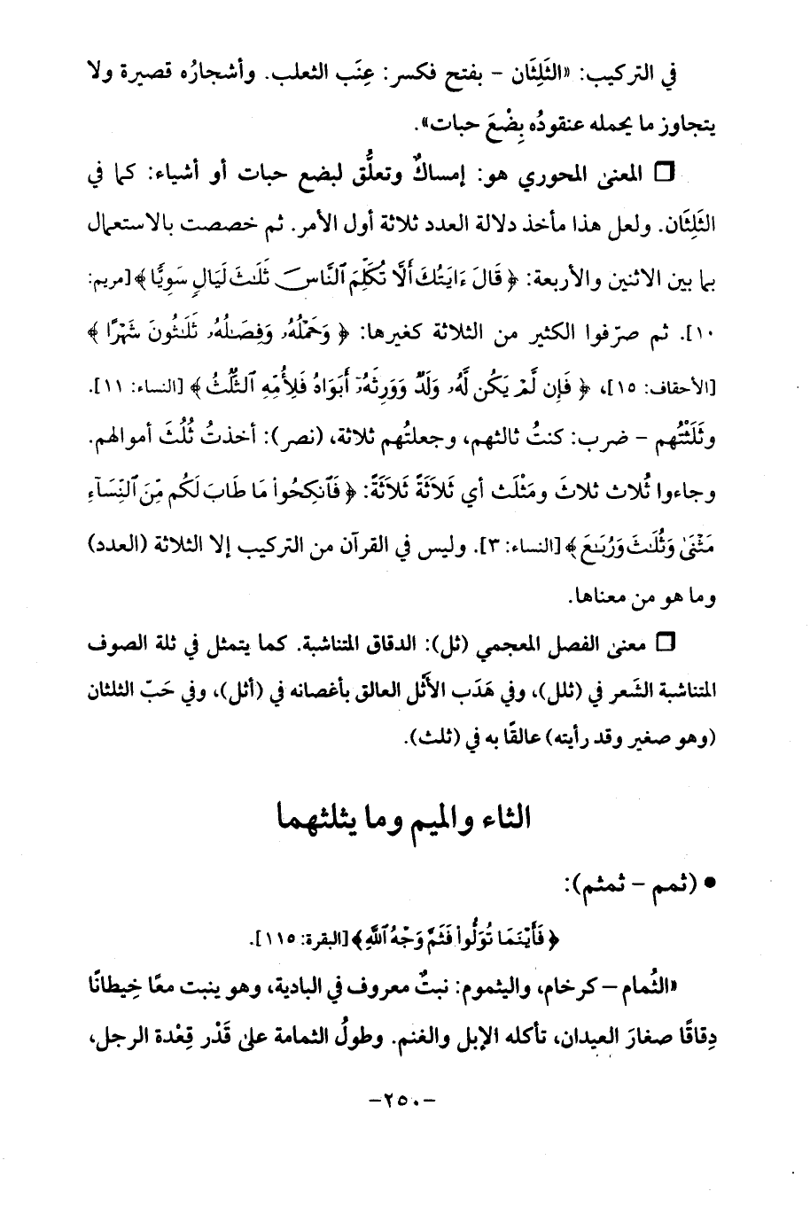 Qهو: إمساكٌ وتعلُّق لبضع حبات أو أشياء: كما في الثَلِثَان. ولعل هذا مأخذ دلالة العدد ثلاثة أول الامر. ثم خصصت بالاستعمال بما بين الاثنين والأربعة: {قَالَ آيَتُكَ أَلَّا تُكَلِّمَ النَّاسَ ثَلَاثَ لَيَالٍ سَوِيًّا} [مريم: 10]. ثم صرّفوا الكثير من الثلاثة كغيرها: {وَحَمْلُهُ وَفِصَالُهُ ثَلَاثُونَ شَهْرًا} [الأحقاف: 15]، {فَإِنْ لَمْ يَكُنْ لَهُ وَلَدٌ وَوَرِثَهُ أَبَوَاهُ فَلِأُمِّهِ الثُّلُثُ} [النساء: 11]. وثَلَثْتُهم - ضرب: كنتُ ثالثهم، وجعلتُهم ثلاثة، (نصر): أخذتُ ثُلُثَ أموالهم. وجاءوا ثُلاث ثلاثَ ومَثْلَث أي ثَلَاثَةً ثَلَاثَةً: {فَانْكِحُوا مَا طَابَ لَكُمْ مِنَ النِّسَاءِ مَثْنَى وَثُلَاثَ وَرُبَاعَ} [النساء: 3]. وليس في القرآن من التركيب إلا الثلاثة (العدد) وما هو من معناها.