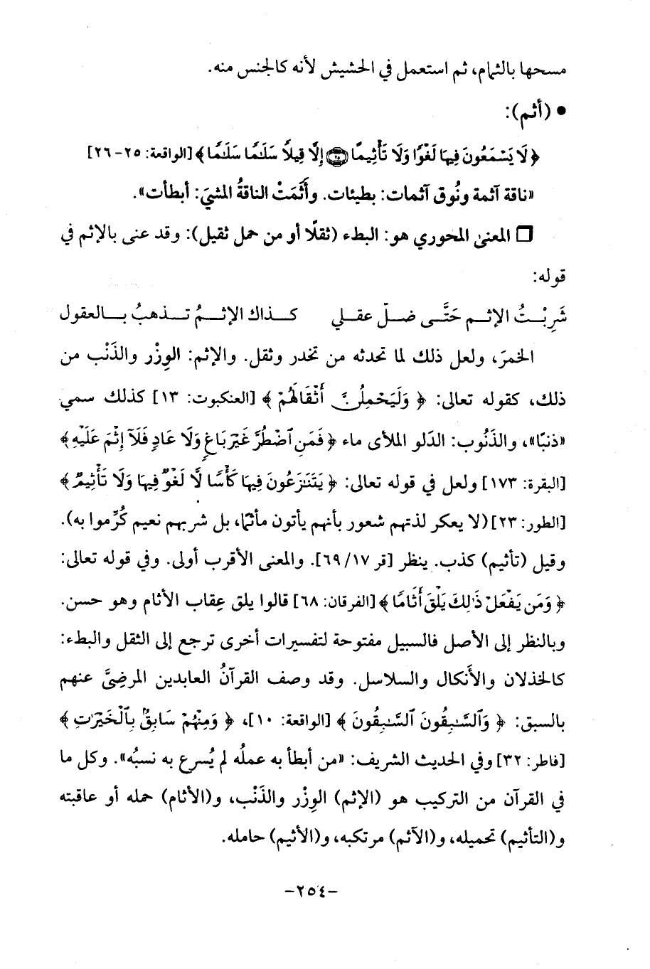 الخمرَ، ولعل ذلك لما تحدثه من تخدر وثقل. والإثم: الوِزْر والذَنْب من ذلك، كقوله تعالى: {وَلَيَحْمِلُنَّ أَثْقَالَهُمْ} [العنكبوت: 13] كذلك سمي "ذنبًا ", والذَنُوب: الدَلو الملأى ماء {فَمَنِ اضْطُرَّ غَيْرَ بَاغٍ وَلَا عَادٍ فَلَا إِثْمَ عَلَيْهِ} [البقرة: 173] ولعل في قوله تعالى: {يَتَنَازَعُونَ فِيهَا كَأْسًا لَا لَغْوٌ فِيهَا وَلَا تَأْثِيمٌ} [الطور: 23] (لا يعكر لذتهم شعور بأنهم يأتون مأثمًا، بل شربهم نعيم كُرِّموا به). وقيل (تأثيم) كذب. ينظر [قر 17/ 69]. والمعنى الأقرب أولى. وفي قوله تعالى: {وَمَنْ يَفْعَلْ ذَلِكَ يَلْقَ أَثَامًا} [الفرقان: 68] قالوا يلق عِقاب الأثام وهو حسن. وبالنظر إلى الأصل فالسبيل مفتوحة لتفسيرات أخرى ترجع إلى الثقل والبطء: كالخذلان والأَنكال والسلاسل. وقد وصف القرآنُ العابدين المرضِيَّ عنهم بالسبق: {وَالسَّابِقُونَ السَّابِقُونَ} [الواقعة: 10]، {وَمِنْهُمْ سَابِقٌ بِالْخَيْرَاتِ} [فاطر: 32] وفي الحديث الشريف: "من أبطأ به عملُه لم يُسرع به نسبُه ". وكل ما في القرآن من التركيب هو (الإثم) الوِزْر والذَنْب، و (الأثام) حمله أو عاقبته و (التأثيم) تحميله، و (الآثم) مرتكبه، و (الأثيم) حامله.
