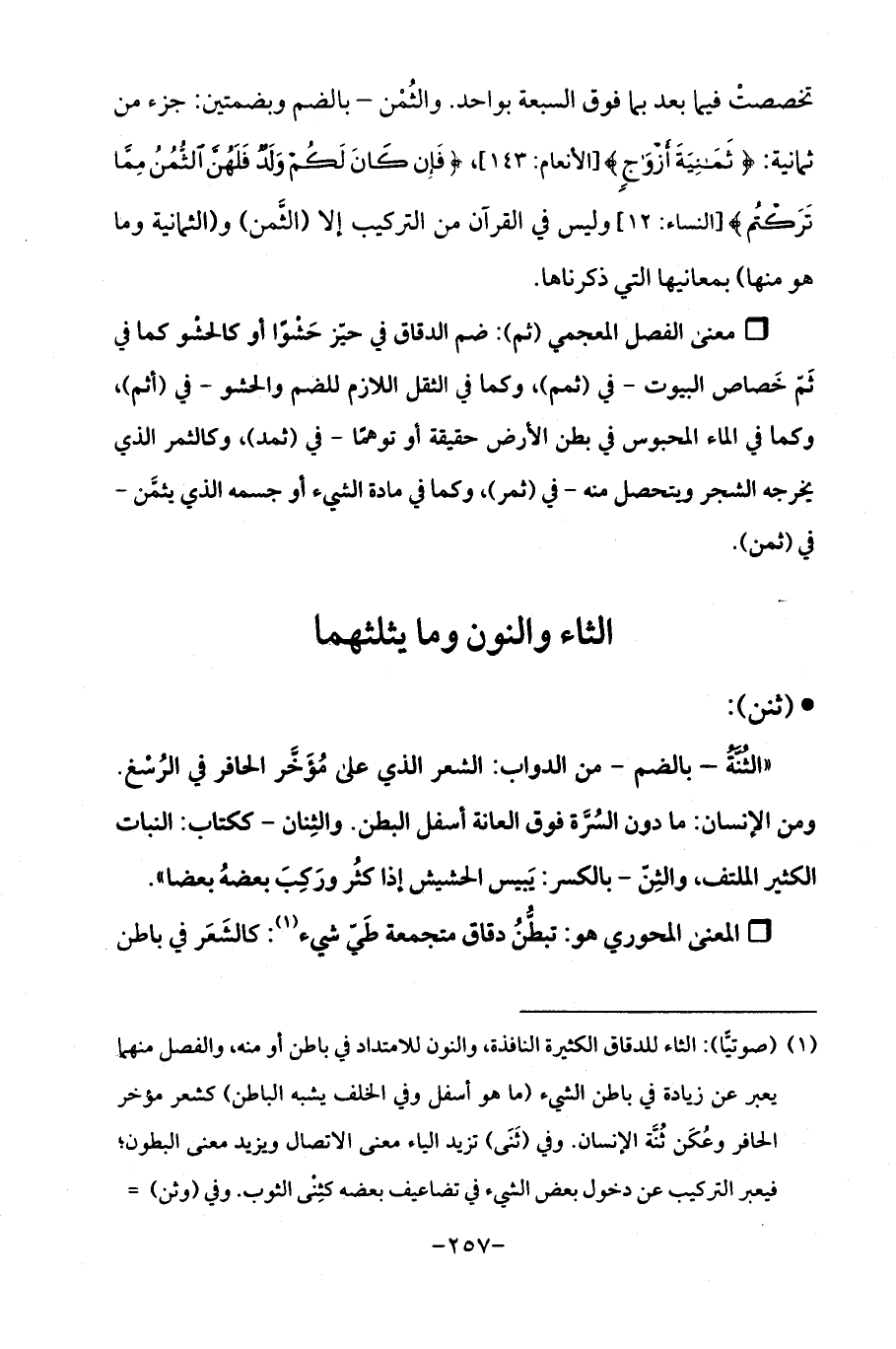 ° معنى الفصل المعجمي (ثم): ضم الدقاق في حيّز حَشْوًا أو كالحشْو كما في ثَمّ خَصاص البيوت - في (ثمم)، وكما في الثقل اللازم للضم والحشو - في (أثم)، وكما في الماء المحبوس في بطن الأرض حقيقة أو توهمًا - في (ثمد)، وكالثمر الذي يخرجه الشجر ويتحصل منه - في (ثمر)، وكما في مادة الشيء أو جسمه الذي يثمَّن - في (ثمن).