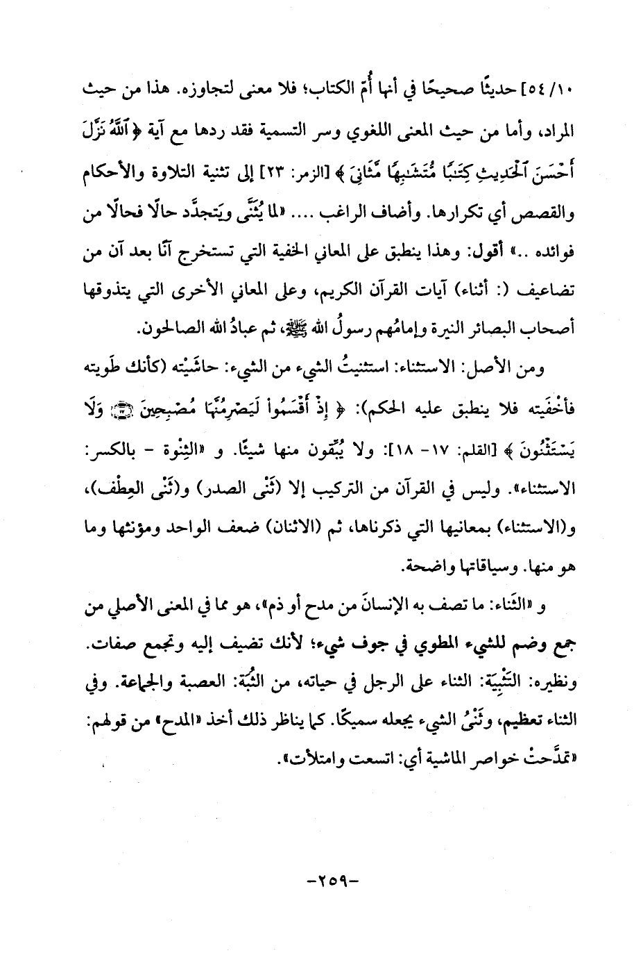 10/ 54] حديثًا صحيحًا في أنها أُمّ الكتاب؛ فلا معنى لتجاوزه. هذا من حيث المراد، وأما من حيث المعنى اللغوي وسر التسمية فقد ردها مع آية {اللَّهُ نَزَّلَ أَحْسَنَ الْحَدِيثِ كِتَابًا مُتَشَابِهًا مَثَانِيَ} [الزمر: 23] إلى تثنية التلاوة والأحكام والقصص أي تكرارها. وأضاف الراغب .... "لما يُثَنَّى ويَتجدَّد حالًا فحالًا من فوائده .. "أقول: وهذا ينطبق على المعاني الخفية التي تستخرج أَنّا بعد آن من تضاعيف (: أثناء) آيات القرآن الكريم، وعلى المعاني الأخرى التي يتذوقها أصحاب البصائر النيرة وإمامُهم رسولُ الله - صلى الله عليه وسلم -، ثم عبادُ الله الصالحون.