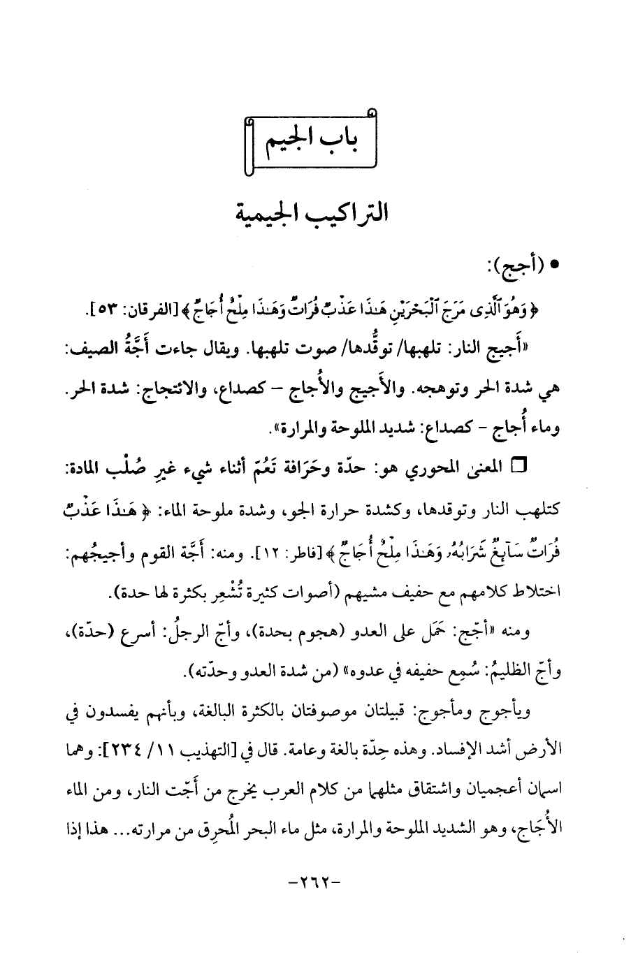 "أَجيج النار: تلهبها/ توقُّدها/ صوت تلهبها. ويقال جاءت أَجَّةُ الصيف: هي شدة الحر وتوهجه. والأَجيج والأُجاج - كصداع، والائتجاج: شدة الحر. وماء أُجاج - كصداع: شديد الملوحة والمرارة ".