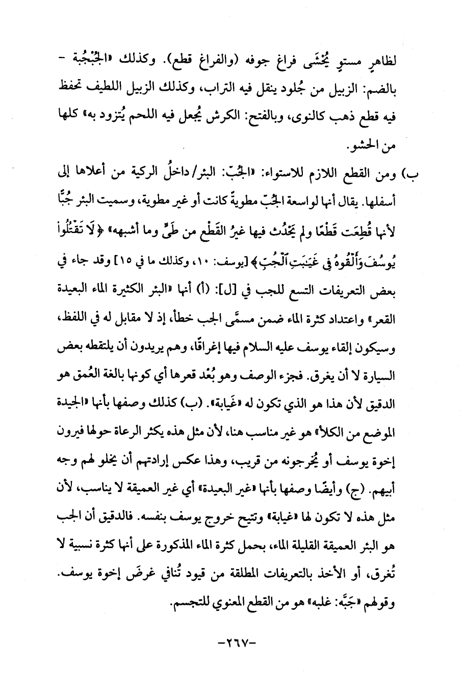 ب) ومن القطع اللازم للاستواء: "الجُبّ: البئر/ داخلُ الركية من أعلاها إلى أسفلها. يقال أنها لواسعة الجُبّ مطويةً كانت أو غير مطوية، وسميت البئر جُبًّا لأنها قُطِعَت قَطْعًا ولم يَحْدُث فيها غيرُ القَطْع من طَيٍّ وما أشبهه " {لَا تَقْتُلُوا يُوسُفَ وَأَلْقُوهُ فِي غَيَابَتِ الْجُبِّ} [يوسف: 10, وكذلك ما في 15] وقد جاء في بعض التعريفات التسع للجب في [ل]: (أ) أنها "البئر الكثيرة الماء البعيدة القعر "واعتداد كثرة الماء ضمن مسمَّى الجب خطأ، إذ لا مقابل له في اللفظ، وسيكون إلقاء يوسف عليه السلام فيها إغراقًا، وهم يريدون أن يلتقطه بعض السيارة لا أن يغرق. فجزء الوصف وهو بُعْد قعرها أي كونها بالغة العُمق هو الدقيق لأن هذا هو الذي تكون له "غَيابة ". (ب) كذلك وصفها بأنها "الجيدة الموضع من الكلأ "هو غير مناسب هنا، لأن مثل هذه يكثر الرعاة حولها فيرون إخوة يوسف أو يُخرجونه من قريب، وهذا عكس إرادتهم أن يخلو لهم وجه أبيهم. (ج) وأيضًا وصفها بأنها "غير البعيدة "أي غير العميقة لا يناسب، لأن مثل هذه لا تكون لها "غيابة "وتتيح خروج يوسف بنفسه. فالدقيق أن الجب هو البئر العميقة القليلة الماء، بحمل كثرة الماء المذكورة على أنها كثرة نسبية لا تُغرق، أو الأخذ بالتعريفات المطلقة من قيود تُنافي غرضَ إخوة يوسف. وقولهم "جَبَّه: غلبه "هو من القطع المعنوي للتجسم.