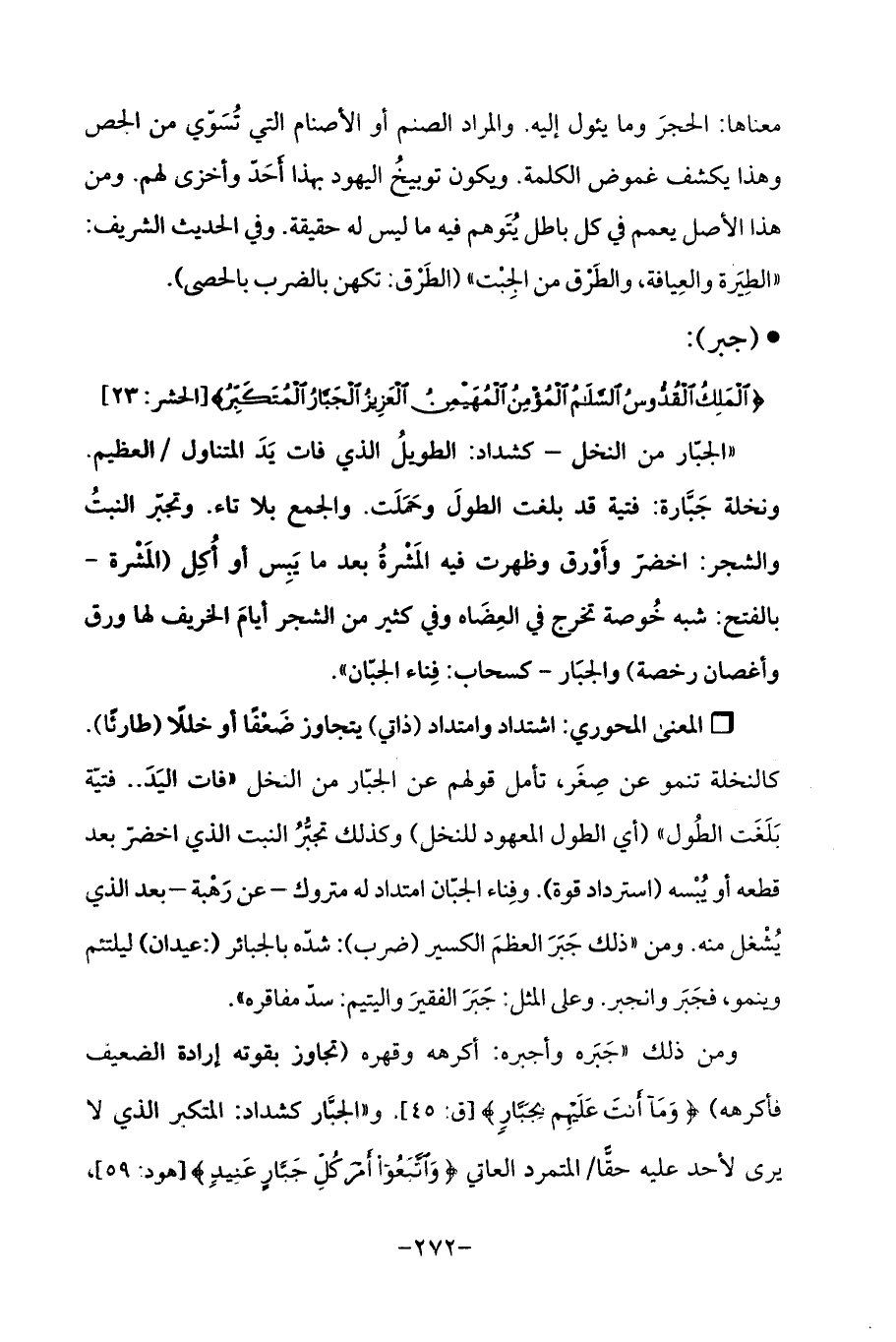 ومن ذلك "جَبَره وأجبره: أكرهه وقهره (تجاوز بقوته إرادة الضعيف فأكرهه) {وَمَا أَنْتَ عَلَيْهِمْ بِجَبَّارٍ} [ق: 45]. و "الجبَّار كشداد: المتكبر الذي لا يرق لأحد عليه حقًّا/ المتمرد العاتي {وَاتَّبَعُوا أَمْرَ كُلِّ جَبَّارٍ عَنِيدٍ} [هود: 59] ,