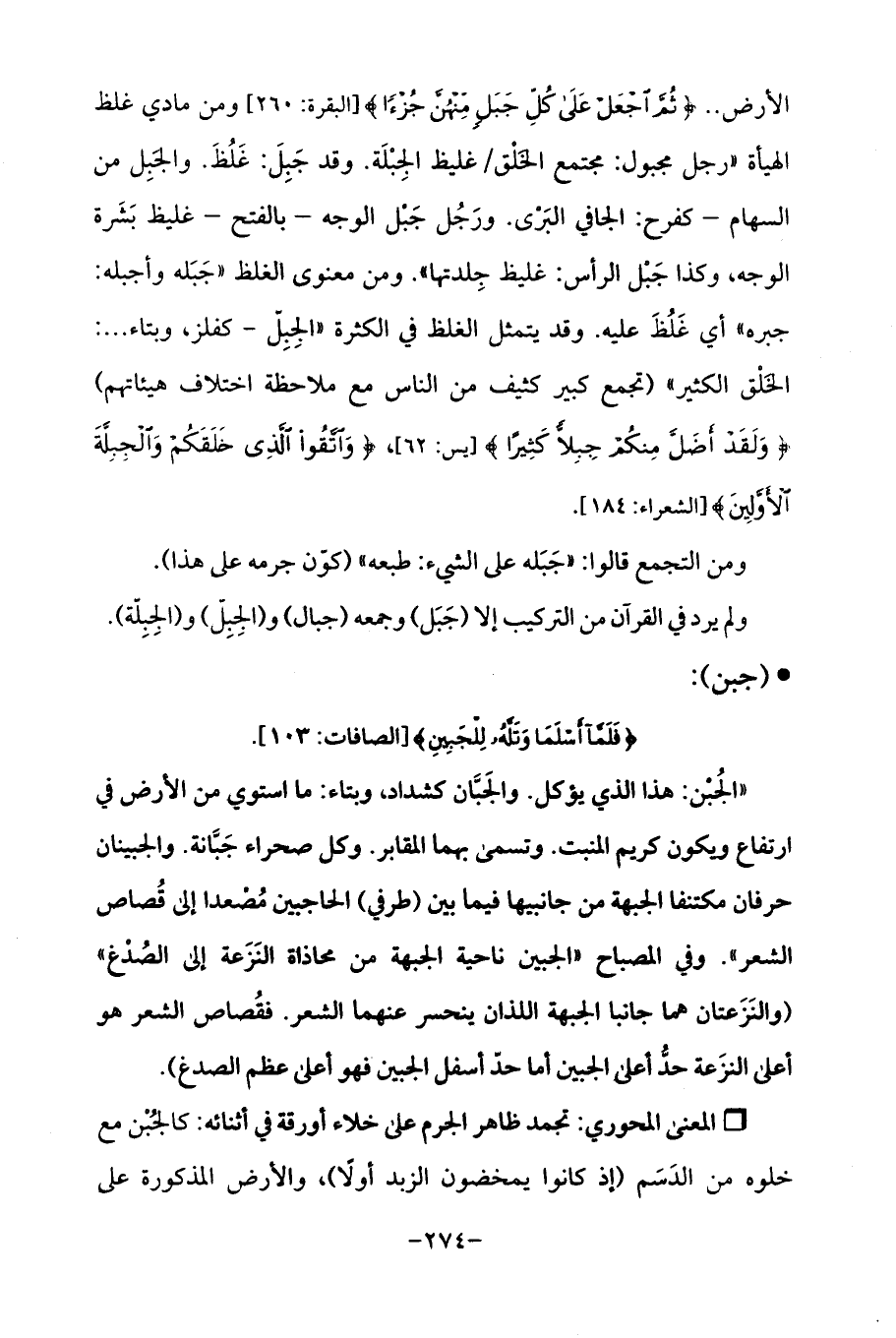 الأرض .. {ثُمَّ اجْعَلْ عَلَى كُلِّ جَبَلٍ مِنْهُنَّ جُزْءًا} [البقرة: 260] ومن مادي غلظ الهيأة "رجل مجبول: مجتمع الخَلْق/ غليظ الجِبْلَة. وقد جَبِلَ: غَلُظَ. والجَبِل من السهام - كفرح: الجافي البَرْى. ورَجُل جَبْل الوجه - بالفتح - غليظ بَشَرة الوجه، وكذا جَبْل الرأس: غليظ جِلدتها ". ومن معنوى الغلظ "جَبَله وأجبله: جبره "أي غَلُظَ عليه. وقد يتمثل الغلظ في الكثرة "الجِبِلّ - كفلز، وبتاء ... : الخَلْق الكثير " (تجمع كبير كثيف من الناس مع ملاحظة اختلاف هيئاتهم) {وَلَقَدْ أَضَلَّ مِنْكُمْ جِبِلًّا كَثِيرًا} [يس: 62] , {وَاتَّقُوا الَّذِي خَلَقَكُمْ وَالْجِبِلَّةَ الْأَوَّلِينَ} [الشعراء: 184].
