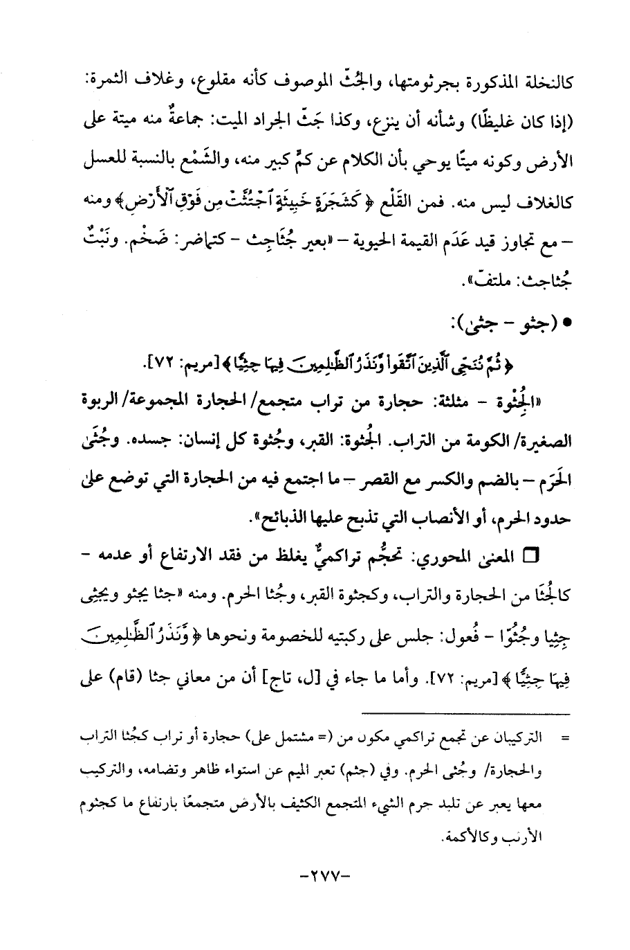 Qتحجُّم تراكميٌّ يغلظ من فقد الارتفاع أو عدمه - كالجُثَا من الحجارة والتراب، وكجثوة القبر، وجُثا الحرم. ومنه "جثا يجثو ويجثِى جِثِيا وجُثُوّا - فُعول: جلس على ركبتيه للخصومة ونحوها {وَنَذَرُ الظَّالِمِينَ فِيهَا جِثِيًّا} [مريم: 72]. وأما ما جاء في [ل، تاج] أن من معاني جثا (قام) على