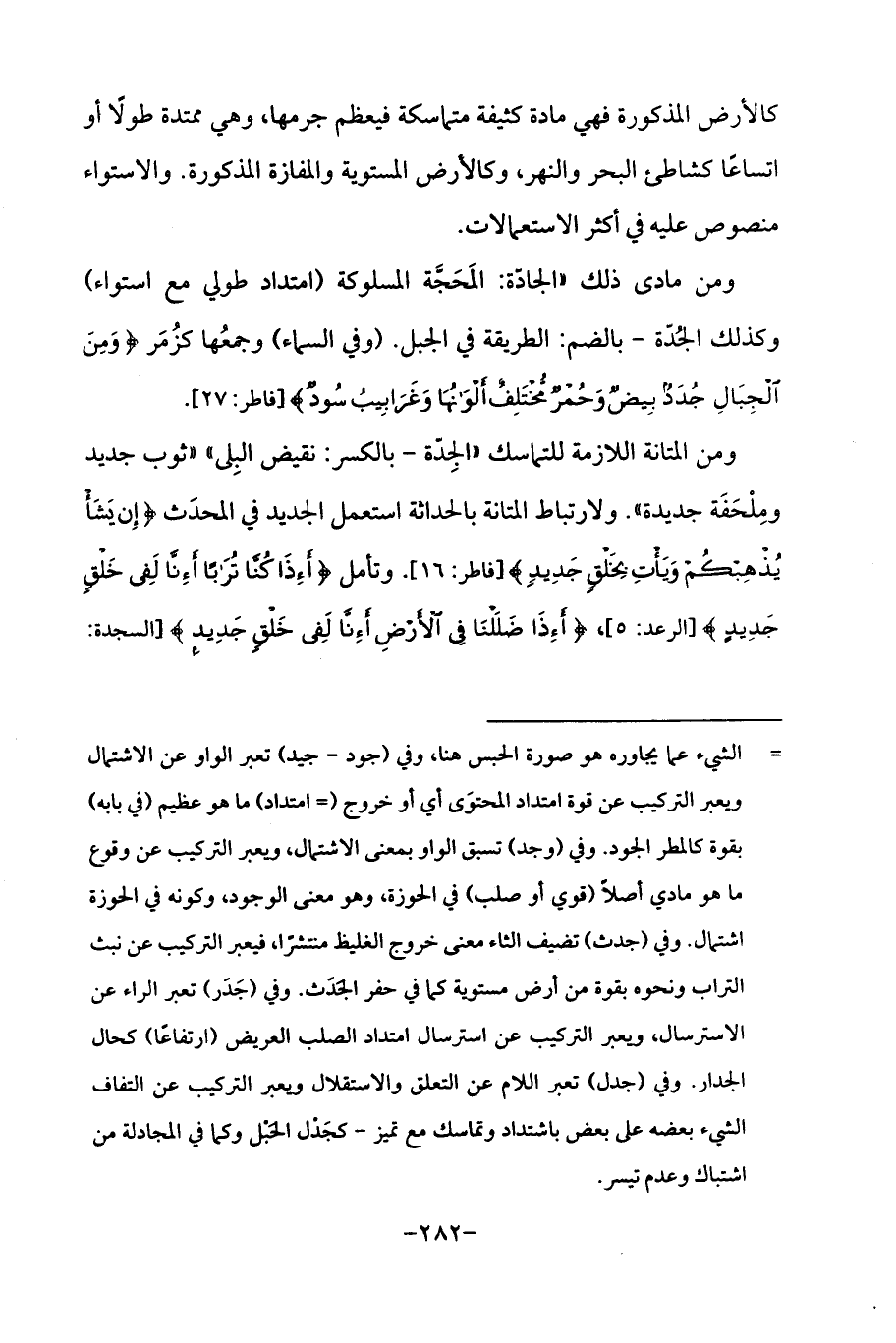 ومن مادى ذلك "الجادّة: المَحَجَّة المسلوكة (امتداد طولي مع استواء) وكذلك الجُدّة - بالضم: الطريقة في الجبل. (وفي السماء) وجمعُها كزُمَر {وَمِنَ الْجِبَالِ جُدَدٌ بِيضٌ وَحُمْرٌ مُخْتَلِفٌ أَلْوَانُهَا وَغَرَابِيبُ سُودٌ} [فاطر: 27].