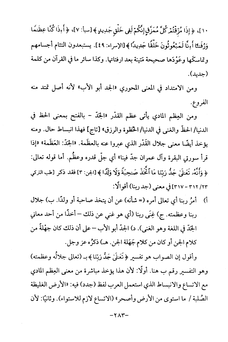 وأقول إن الصواب هو تفسير {تَعَالَى جَدُّ رَبِّنَا} بـ (تعالى جلالُه وعظمته) وهو التفسير رقم ب هنا. أولًا: لأن هذا يؤخذ مباشرة من معنى العِظم المادي مع الاتساع والانبساط الذي استعمل العرب لفظ (جدد) فيه: "الأرض الغليظة الصُلبة/ ما استوى من الأرض وأصحر " (الاتساع لازم للاستواء). وثانيًا: لأن