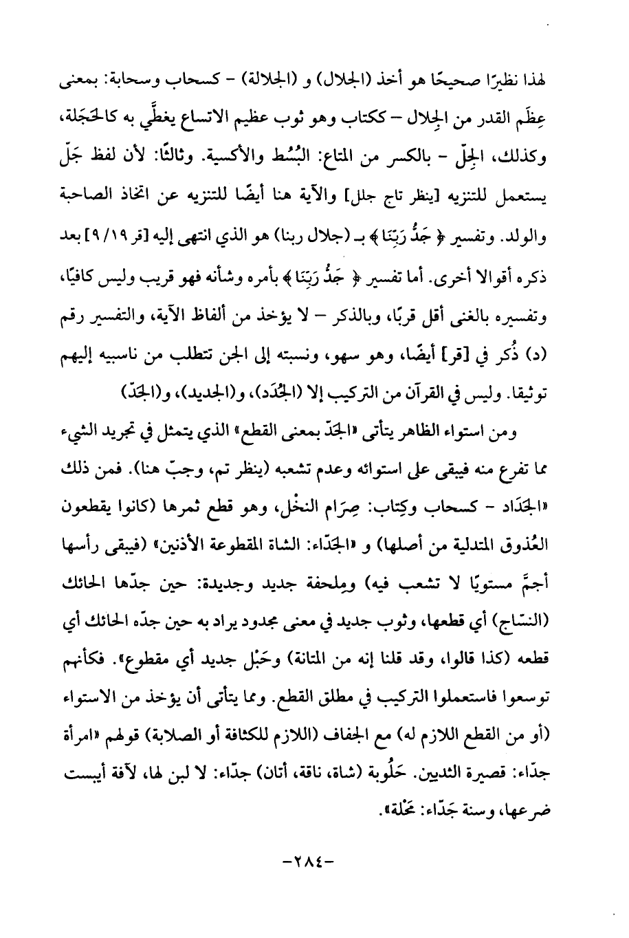 لهذا نظيرًا صحيحًا هو أخذ (الجلال) و (الجلالة) - كسحاب وسحابة: بمعنى عِظَم القدر من الجِلال - ككتاب وهو ثوب عظيم الاتساع يغطَّي به كالحَجَلة، وكذلك، الجِلّ - بالكسر من المتاع: البُسُط والأكسية. وثالثًا: لأن لفظ جَلّ يستعمل للتنزيه [ينظر تاج جلل] والآية هنا أيضًا للتنزيه عن اتخاذ الصاحبة والولد. وتفسير {جَدُّ رَبِّنَا} بـ (جلال ربنا) هو الذي انتهى إليه [قر 19/ 9] بعد ذكره أقوالا أخرى. أما تفسير {جَدُّ رَبِّنَا} بأمره وشأنه فهو قريب وليس كافيًا، وتفسيره بالغنى أقل قربًا، وبالذكر - لا يؤخذ من ألفاظ الآية، والتفسير رقم (د) ذُكر في [قر] أيضًا، وهو سهو، ونسبته إلى الجن تتطلب من ناسبيه إليهم توثيقا. وليس في القرآن من التركيب إلا (الجُدَد)، و (الجديد)، و (الجَدّ)