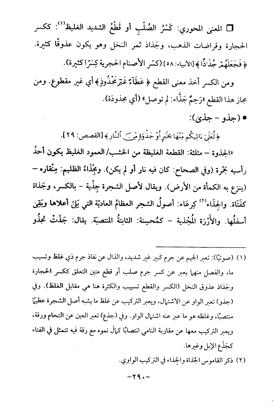 (¬1) (صوتيًا): تعبر الجيم عن جرم كبير غير شديد، والذال عن نفاذ جرم ذي غلظ وتسيب ما، والفصل منهما يعبر عن كسر جرم صلب أو قطع متين التعلق ككسر الحجارة وجَذاذ عذوق النخل (الكسر والقطع تسييب والكثرة هنا هي مقابل الغلظ). وفي (جذو) تعبر الواو عن الاشتمال، ويعبر التركيب عن غلظ ما يشبه أصل الشجرة عظيمًا منتصبًا، وغلظه هو ما عبر عنه اشتمال الواو. وفي (جذع) تعبر العين عن التحام ورقة، ويعبر التركيب معها عن مقاربة النامي انتصابًا كمالَ نموه مع رقة فيه تتمثل في الفتاء كجَذَع الإبل وغيرها.