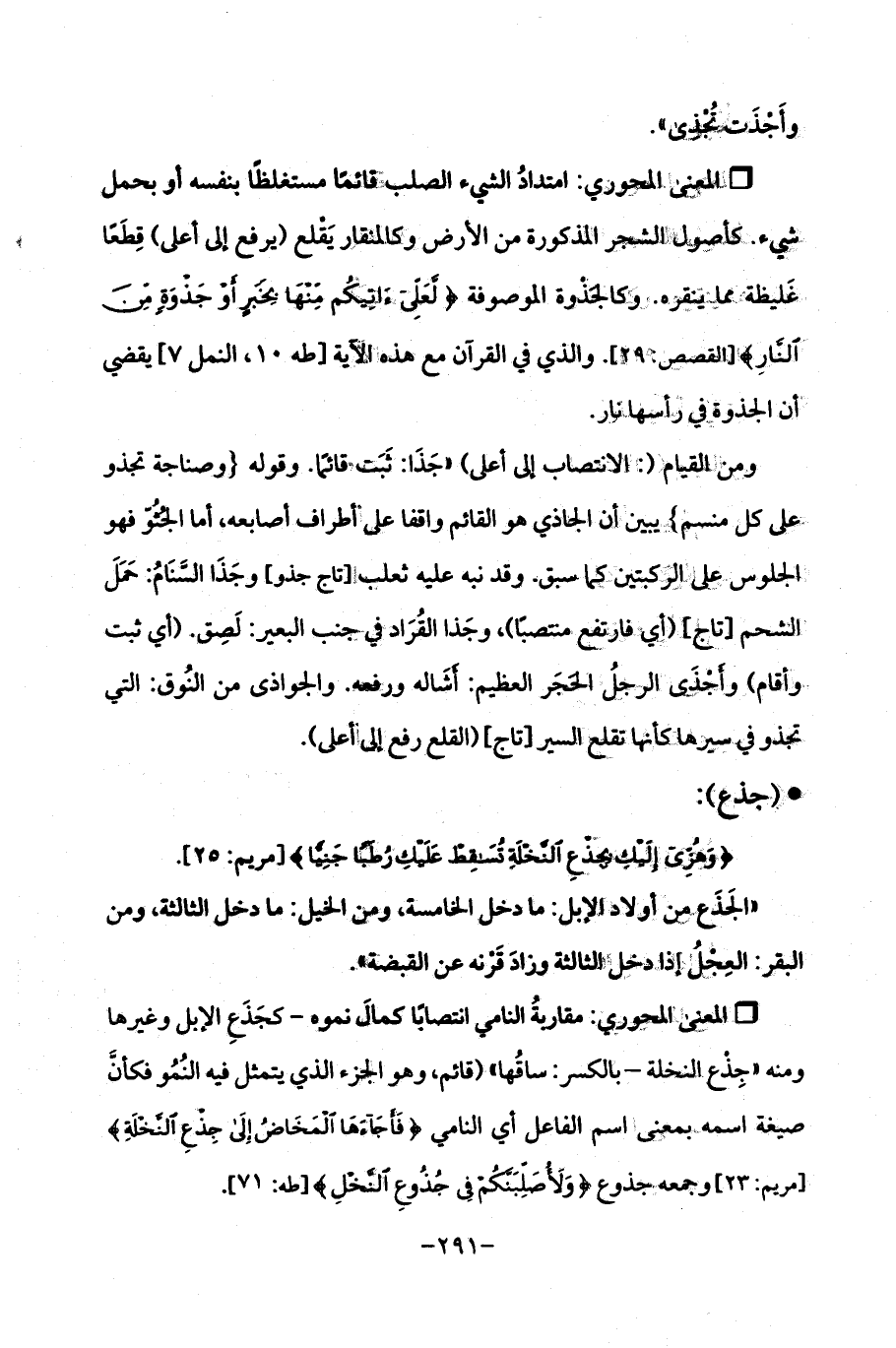 Qامتدادُ الشيء الصلب قائمًا مستغلظًا بنفسه أو بحمل شيء. كأصول الشجر المذكورة من الأرض وكالمنقار يَقْلع (يرفع إلى أعلى) قِطَعًا غَليظة مما ينقره. وكالجَذْوة الموصوفة {لَعَلِّي آتِيكُمْ مِنْهَا بِخَبَرٍ أَوْ جَذْوَةٍ مِنَ النَّارِ} [القصص: 29]. والذي في القرآن مع هذه الآية [طه 10، النمل 7] يقضي أن الجذوة في رأسها نار.