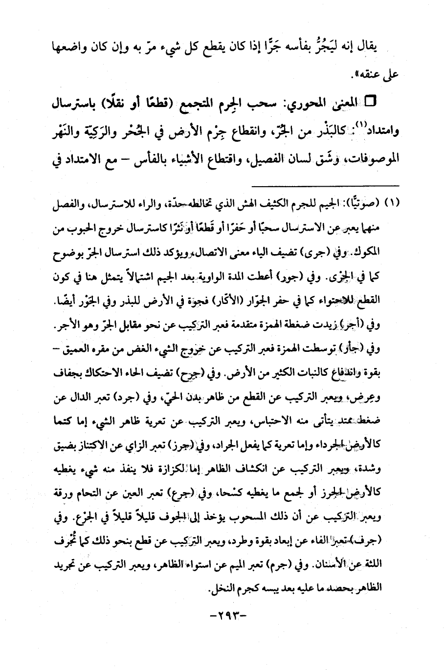 (¬1) (صوتيًّا): الجيم للجرم الكثيف الهش الذي تخالطه حدّة، والراء للاسترسال، والفصل منهما يعبر عن الاسترسال سحبًا أو حَفرًا أو قَطعًا أو نَثرًا كاسترسال خروج الحبوب عن المكوك. وفي (جرى) تضيف الياء معنى الاتصال, ويؤكد ذلك استرسال الجرّ بوضوح كما في الجرى. وفي (جور) أعطت المدة الواوية بعد الجيم اشتمالًا يتمثل هنا في كون القطع للاحتواء كما في حفر الجوّار (الأكّار) فجوة في الأرض لبذر وفي الجَوْر أيضًا. وفي (أجر) زيدت ضغطة الهمزة متقدمة فعبر التركيب عن نحو مقابل الجرّ وهو الأجر. وفي (جأر) توسطت الهمزة فعبر التركيب عن خروج الشيء الغض من مقره العميق - بقوة واندفاع كالنبات الكثير من الأرض. وفي (جرح) تضيف الحاء الاحتكاك بجفاف وعِرض، ويعبر التركيب عن القطع من ظاهر بدن الحيّ، وفي (جرد) تعبر الدال عن ضغط ممتد يتأتى منه الاحتباس, ويعبر التركيب عن تعرية ظاهر الشيء إما كتما كالأرض الجرداء وإما تعرية كما يفعل الجراد, وفي (جرز) تعبر الزاي عن الاكتناز بضيق وشدة، ويعبر التركيب عن انكشاف الظاهر إما لكزازة فلا ينفذ منه شيء يغطيه كالأرض الجرز أو لجمع ما يغطيه كسْحا، وفي (جرع) تعبر العين عن التحام ورقة ويعبر التركيب عن أن ذلك المسحوب يؤخذ إلى الجوف قليلًا قليلًا في الجرْع. وفي (جرف). تعبر الفاء عن إبعاد بقوة وطرد، ويعبر التركيب عن قطع بنحو ذلك كما تُجْرف اللثة عن الأسنان. وفي (جرم) تعبر الميم عن استواء الظاهر، ويعبر التركيب عن تجريد الظاهر بحصد ما عليه بعد يبسه كجرم النخل.