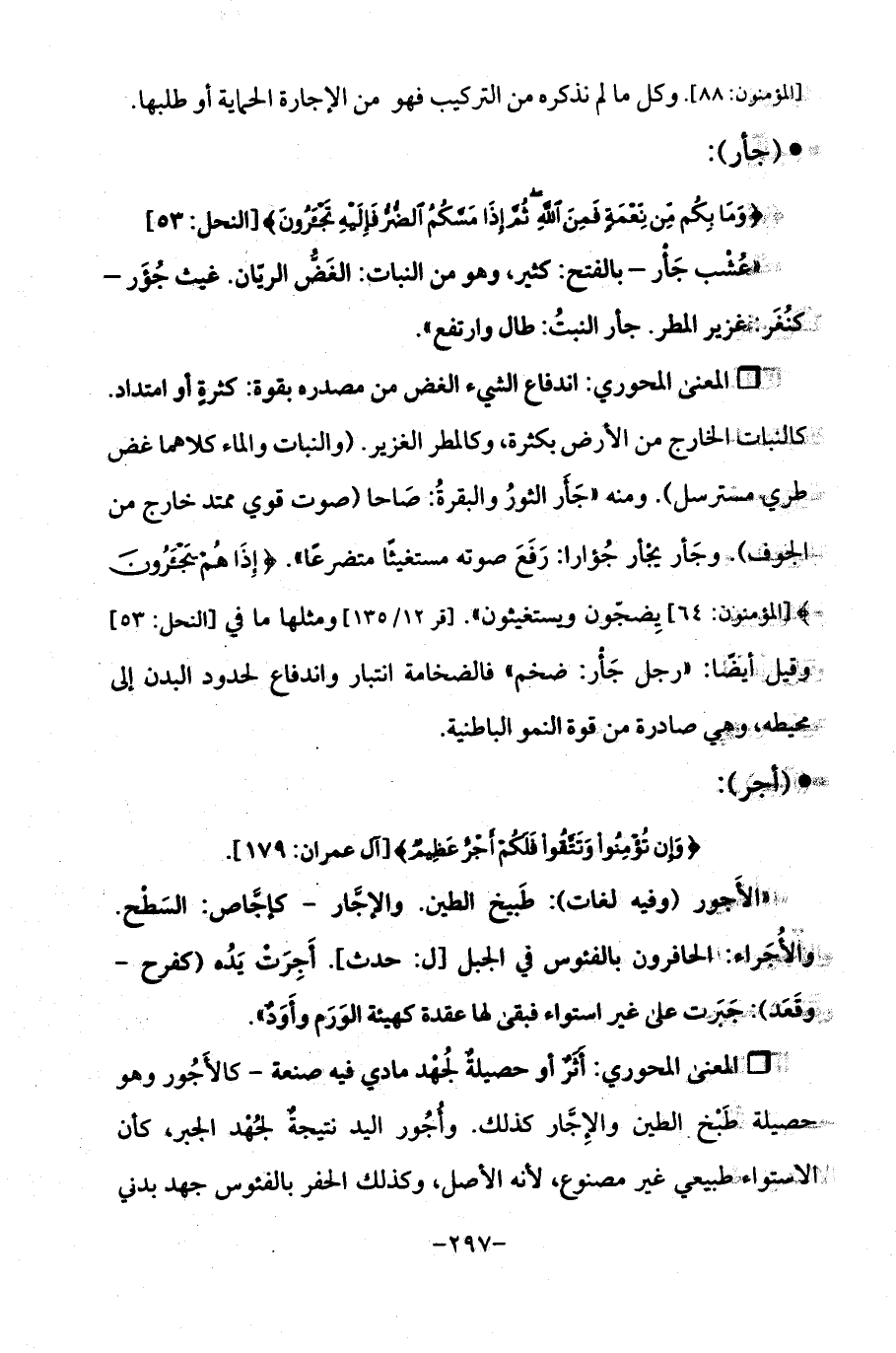 "الأَجور (وفيه لغات): طَبيخ الطين. والإجَّار - كإجَّاص: السَطْح. والأُجَراء: الحافرون بالفئوس في الجبل [ل: حدث]. أَجِرَتْ يَدُه (كفرح - وقَعَد): جبرت على غير استواء فبقى لها عقدة كهيئة الوَرَم وأَوَدٌ ".