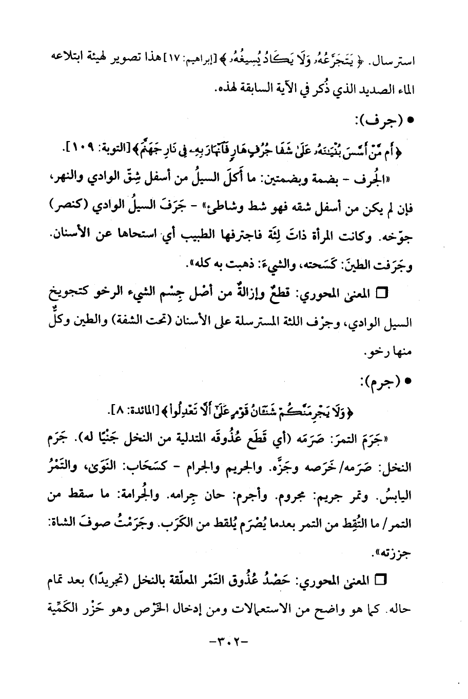 "جَرَمَ التمرَ: صَرَمَه (أي قَطَع عُذُوقَه المتدلية من النخل جَنْيًا له). جَرَم النخل: صَرَمه/ خَرَصه وجَزَّه. والجريم والجرام - كسَحَاب: النَوَى، والتَمْرُ اليابسُ. وتمر جريم: مجروم. وأجرم: حان جِرامه. والجُرامة: ما سقط من التمر/ ما التُقِط من التمر بعد ما يُصْرَم يُلقط من الكَرَب. وجَرَمْتُ صوفَ الشاة: جززته ".