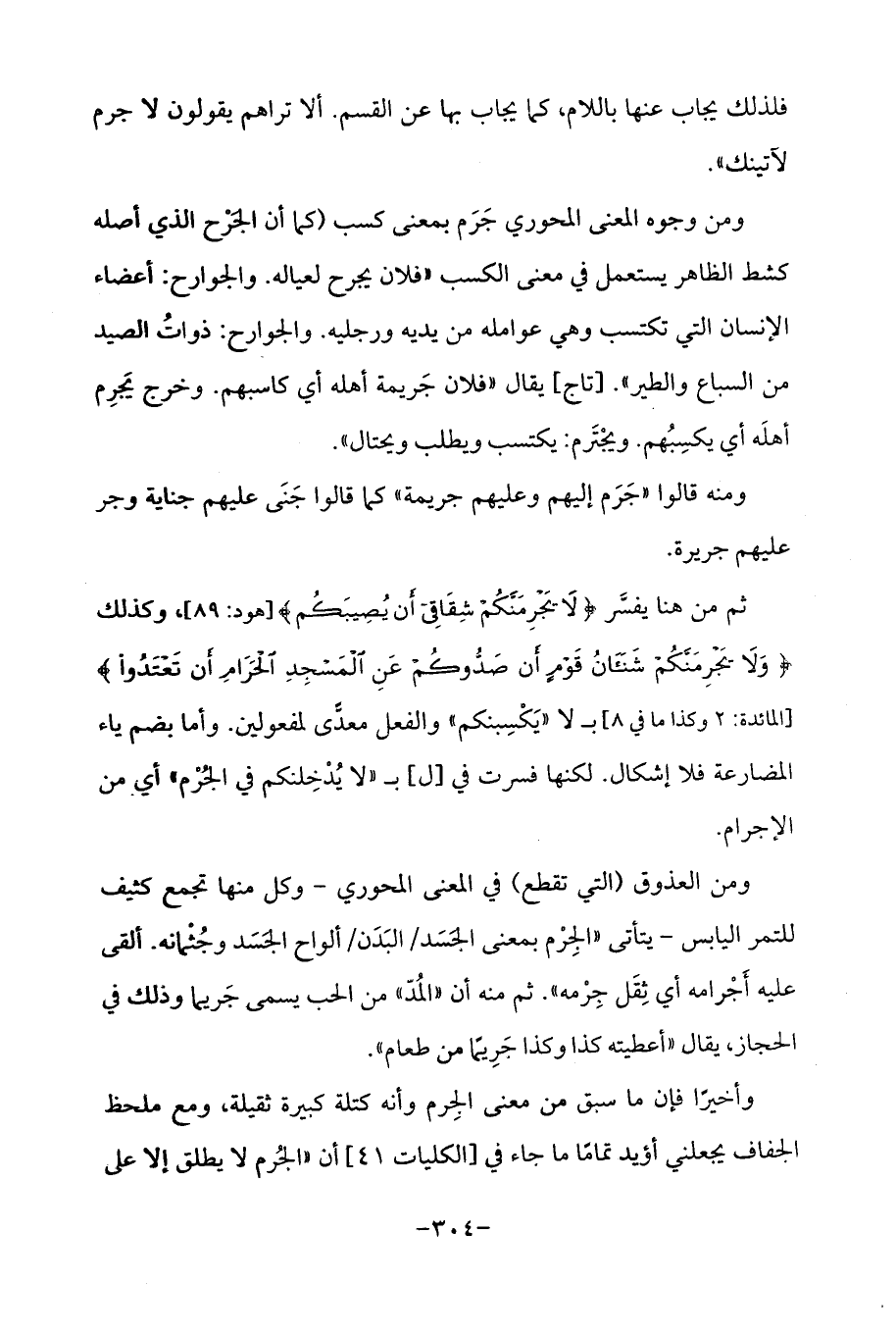 ثم من هنا يفسَّر {لَا يَجْرِمَنَّكُمْ شِقَاقِي أَنْ يُصِيبَكُمْ} [هود: 89]، وكذلك {وَلَا يَجْرِمَنَّكُمْ شَنَآنُ قَوْمٍ أَنْ صَدُّوكُمْ عَنِ الْمَسْجِدِ الْحَرَامِ أَنْ تَعْتَدُوا} [المائدة: 2 وكذا ما في 8] بـ لا "يَكْسِبنكم "والفعل معدًّى لمفعولين. وأما بضم ياء المضارعة فلا إشكال. لكنها فسرت في [ل] بـ "لا يُدْخِلنكم في الجُرْم "أي من الإجرام.