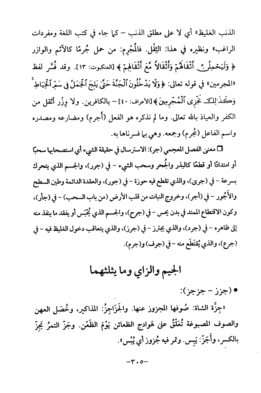 الذنب الغليظ "أي لا على مطلق الذنب - كما جاء في كتب اللغة ومفردات الراغب "ونظيره في هذا: الثِقْل. فالمُجْرِم: من حمل جُرمًا كالآثم والوازر {وَلَيَحْمِلُنَّ أَثْقَالَهُمْ وَأَثْقَالًا مَعَ أَثْقَالِهِمْ} [العنكبوت: 13]. وقد فُسَّر لفظ "المجرمين "في قوله تعالى: {وَلَا يَدْخُلُونَ الْجَنَّةَ حَتَّى يَلِجَ الْجَمَلُ فِي سَمِّ الْخِيَاطِ وَكَذَلِكَ نَجْزِي الْمُجْرِمِينَ} [الأعراف: 40]- بالكافرين. ولا وِزْر أثقل من الكفر والعياذ بالله تعالى. وما لم نذكره هو الفعل (أَجرم) ومضارعه ومصدره واسم الفاعل (مُجرم) وجمعه. وهي بما فسرناها به.