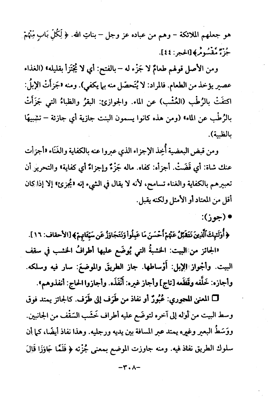 Qعُبُورٌ أو نفاذ من طَرَف الى طَرَف. كالجائز يمتد فوق وسط البيت من أوله إلى آخره لتوضَع عليه أطراف خَشَب السَقْف من الجانبين. ووَسَطُ البعير وغيره يمتد عبر المسافة بين يديه ورجليه. وهذا نفاذ أيضًا، كما أن سلوك الطريق نفاذ فيه. ومنه جاوزت الموضع بمعنى جُزْته {فَلَمَّا جَاوَزَا قالَ