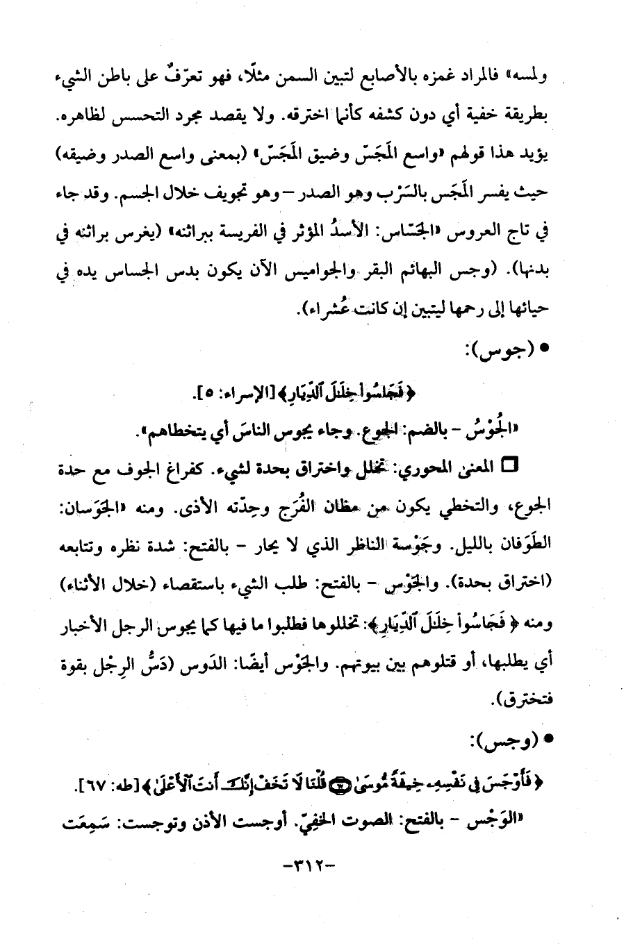 ولمسه "فالمراد غمزه بالأصابع لتبين السمن مثلًا، فهو تعرّفٌ على باطن الشيء بطريقة خفية أي دون كشفه كأنما اخترقه. ولا يقصد مجرد التحسس لظاهره. يؤيد هذا قولهم "واسع المَجَسّ وضيق المَجَسّ " (بمعنى واسع الصدر وضيقه) حيث يفسر المَجَس بالسَرْب وهو الصدر - وهو تجويف خلال الجسم. وقد جاء في تاج العروس "الجَسّاس: الأسدُ المؤثر في الفريسة ببراثنه " (يغرس براثنه في بدنها). (وجس البهائم البقر والجواميس الآن يكون بدس الجساس يده في حيائها إلى رحمها ليتبين إن كانت عُشراء).