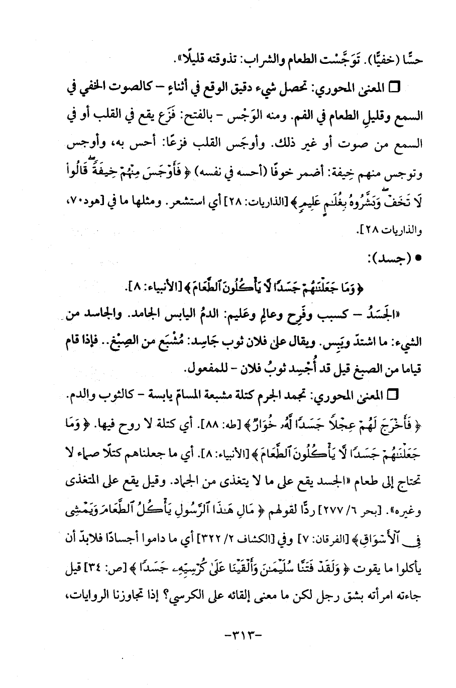 Qتجمد الجرم كتلة مشبعة المسامّ يابسة - كالثوب والدم. {فَأَخْرَجَ لَهُمْ عِجْلًا جَسَدًا لَهُ خُوَارٌ} [طه: 88]. أي كتلة لا روح فيها. {وَمَا جَعَلْنَاهُمْ جَسَدًا لَا يَأْكُلُونَ الطَّعَامَ} [الأنبياء: 8]. أي ما جعلناهم كتلًا صماء لا تحتاج إلى طعام "الجسد يقع على ما لا يتغذى من الجماد. وقيل يقع على المتغذى وغيره ". [بحر 6/ 277] ردًّا لقولهم {مَالِ هَذَا الرَّسُولِ يَأْكُلُ الطَّعَامَ وَيَمْشِي فِي الْأَسْوَاقِ} [الفرقان: 7] وفي [الكشاف 2/ 322] أي ما داموا أجسادًا فلا بدَّ أن يأكلوا ما يقوت {وَلَقَدْ فَتَنَّا سُلَيْمَانَ وَأَلْقَيْنَا عَلَى كُرْسِيِّهِ جَسَدًا} [ص: 34] قيل جاءته امرأته بشق رجل لكن ما معنى إلقائه على الكرسي؟ إذا تجاوزنا الروايات،