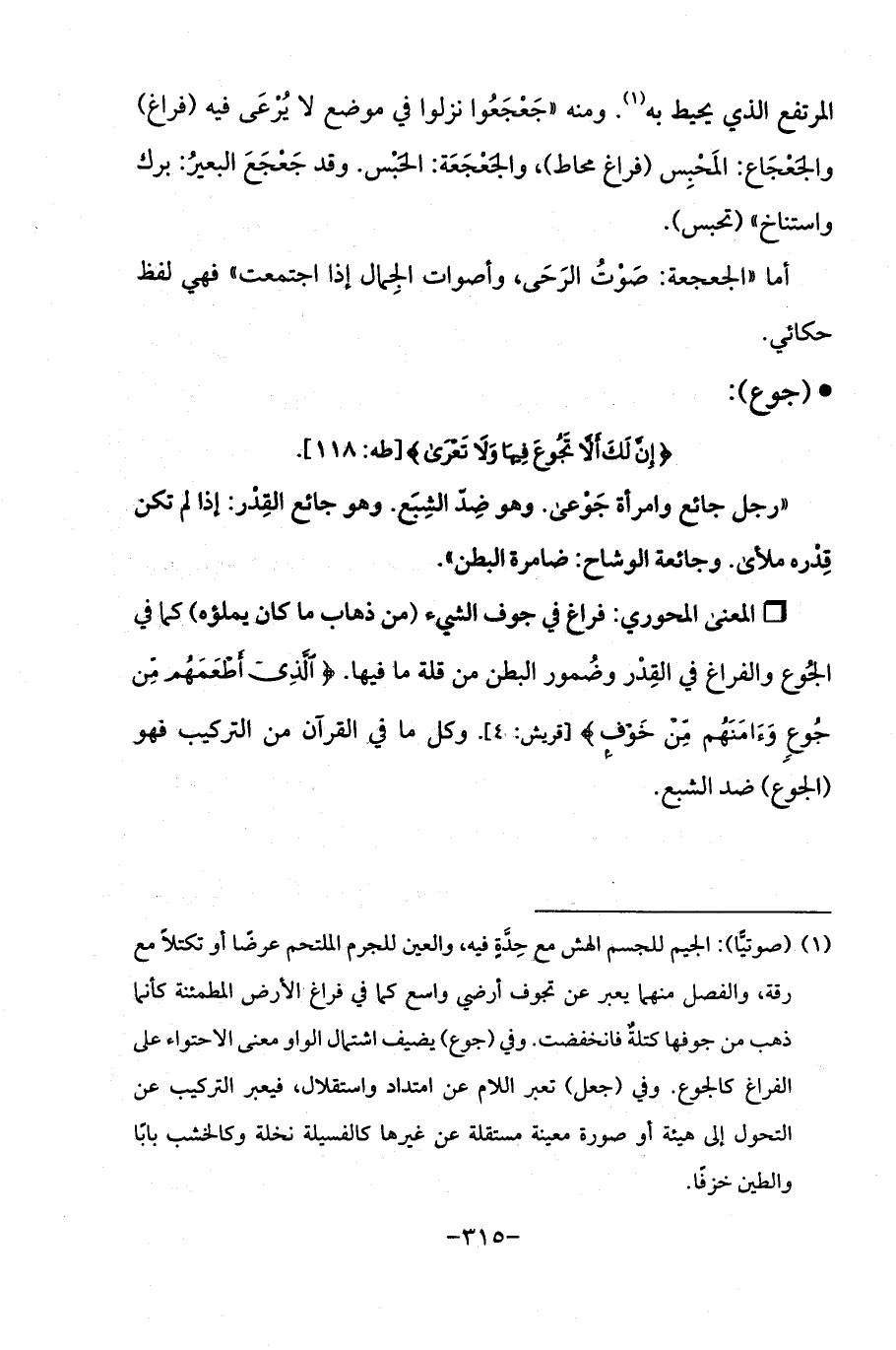 Qفراغ في جوف الشيء (من ذهاب ما كان يملؤه) كما في الجُوع والفراغ في القِدْر وضُمور البطن من قلة ما فيها. {الَّذِي أَطْعَمَهُمْ مِنْ جُوعٍ وَآمَنَهُمْ مِنْ خَوْفٍ} [قريش: 4]. وكل ما في القرآن من التركيب فهو (الجوع) ضد الشبع.