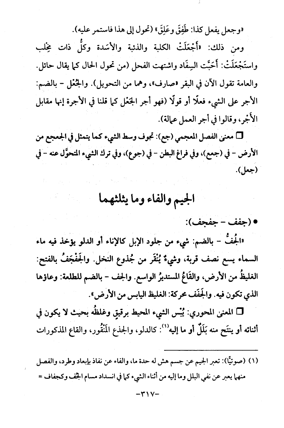 (¬1) (صوتيًّا): تعبر الجيم عن جسم هش له حدة ما، والفاء عن نفاذ بإبعاد وطرد، والفصل منهما يعبر عن نفي البلل وما إليه من أثناء الشيء كما في انسداد مسام الجُف وكجفاف =