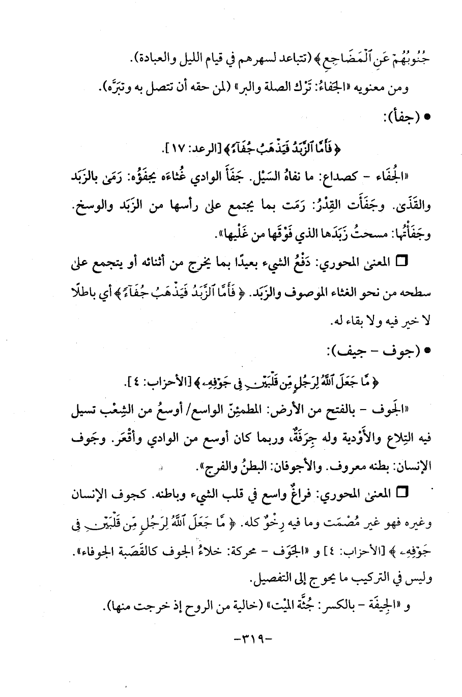Qدَفْعُ الشيء بعيدًا بما يخرج من أثنائه أو يتجمع على سطحه من نحو الغثاء الموصوف والزَبَد. {فَأَمَّا الزَّبَدُ فَيَذْهَبُ جُفَاءً} أي باطلًا لا خير فيه ولا بقاء له.