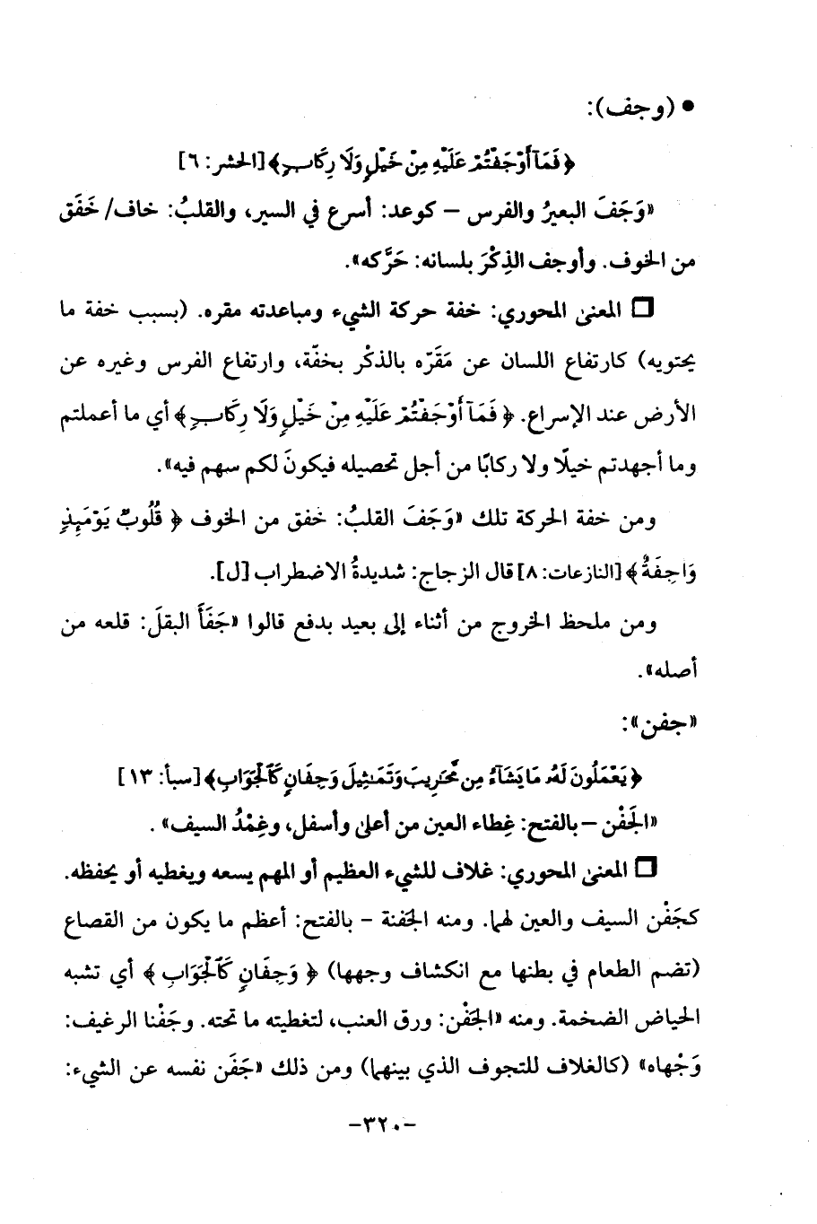 Qخفة حركة الشيء ومباعدته مقره. (بسبب خفة ما يحتويه) كارتفاع اللسان عن مَقَرّه بالذكْر بخفَّة، وارتفاع الفرس وغيره عن الأرض عند الإسراع. {فَمَا أَوْجَفْتُمْ عَلَيْهِ مِنْ خَيْلٍ وَلَا رِكَابٍ} أي ما أعملتم وما أجهدتم خيلًا ولا ركابًا من أجل تحصيله فيكونَ لكم سهم فيه ".