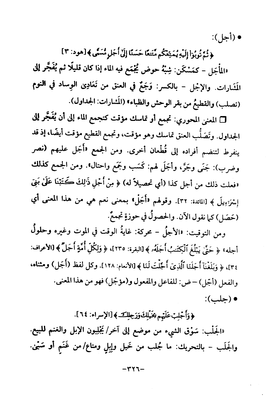 ومن التوقيت: "الأجلُ - محركة: غايةُ الوقت في الموت وغيره وحلولُ أجله " {حَتَّى يَبْلُغَ الْكِتَابُ أَجَلَهُ} [البقرة: 235]، {وَلِكُلِّ أُمَّةٍ أَجَلٌ} [الأعراف: 34]، {وَبَلَغْنَا أَجَلَنَا الَّذِي أَجَّلْتَ لَنَا} [الأنعام: 128]. وكل لفظ (أَجَل) ومثناه، والفعل (أجّل) - ض: للفاعل والمفعول و (مؤجّل) فهو من هذا المعنى.