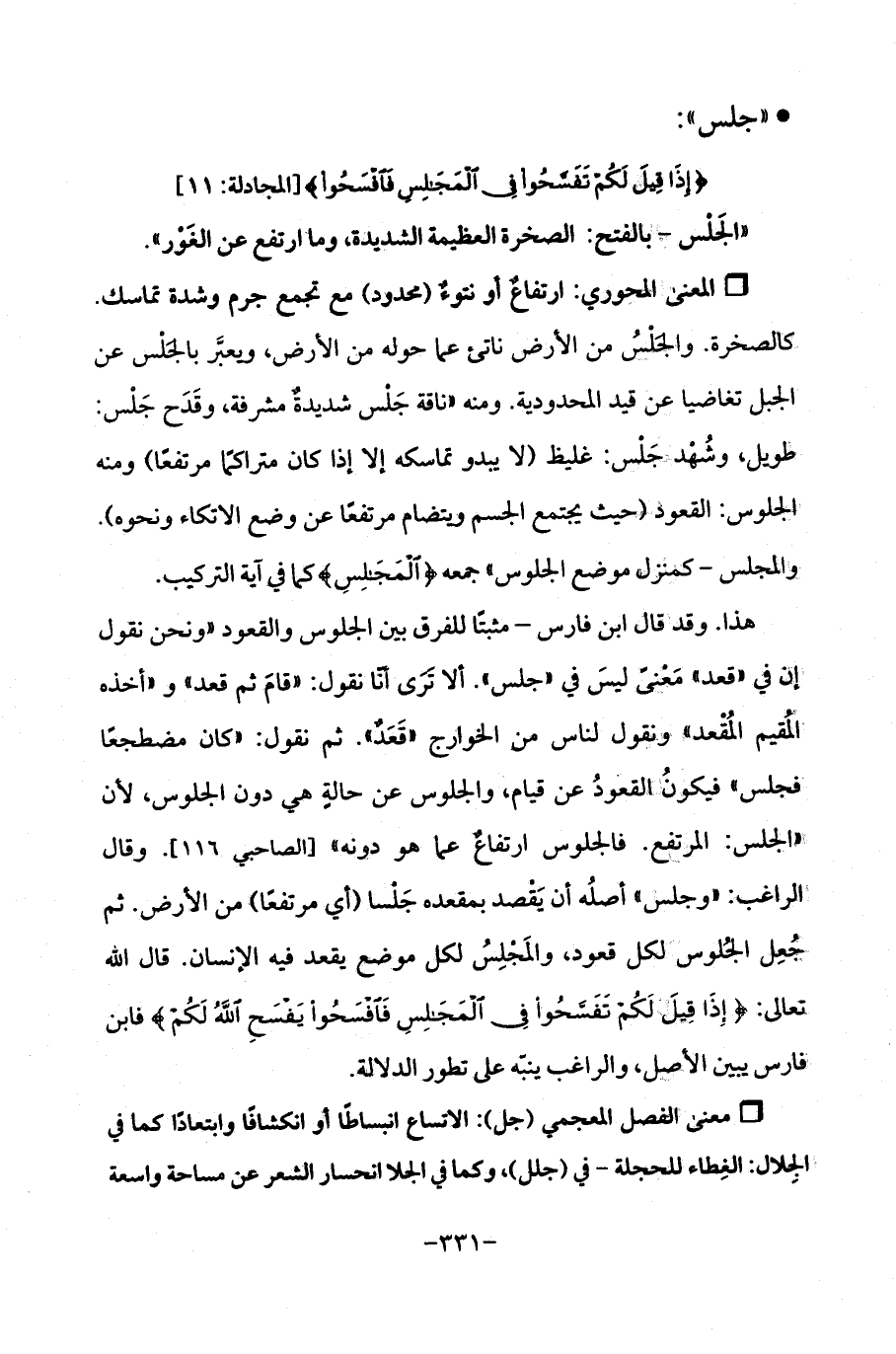 هذا. وقد قال ابن فارس - مثبتًا للفرق بين الجلوس والقعود "ونحن نقول إن في "قعد "مَعْنى ليسَ في "جلس ". ألا تَرَى أنّا نقول: "قامَ ثم قعد "و "أخذه المُقيم المُقْعد "ونقول لناس من الخوارج "قَعَدٌ ". ثم نقول: "كان مضطجعًا فجلس "فيكونُ القعودُ عن قيام، والجلوس عن حالةٍ هي دون الجلوس، لأن "الجلس: المرتفع. فالجلوس ارتفاعٌ عما هو دونه " [الصاحبي 116]. وقال الراغب: "وجلس "أصلُه أن يَقْصد بمقعده جَلْسا (أي مرتفعًا) من الأرض. ثم جُعِل الجُلوس لكل قعود، والمَجْلِسُ لكل موضع يقعد فيه الإنسان. قال الله تعالى: {إِذَا قِيلَ لَكُمْ تَفَسَّحُوا فِي الْمَجَالِسِ فَافْسَحُوا يَفْسَحِ اللَّهُ لَكُمْ} فابن فارس يبين الأصل، والراغب ينبّه على تطور الدلالة.