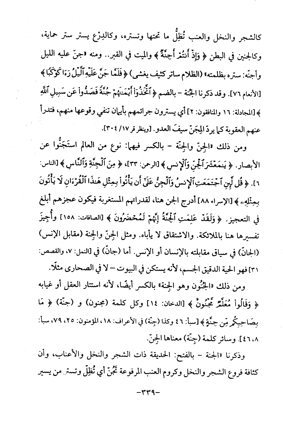 ومن ذلك "الجِنّ والجِنّة - بالكسر فيهما: نوع من العالم استَجَنُّوا عن الأبصار. {يَامَعْشَرَ الْجِنِّ وَالْإِنْسِ} [الرحمن: 33] , {مِنَ الْجِنَّةِ وَالنَّاسِ} [الناس: 6]. {قُلْ لَئِنِ اجْتَمَعَتِ الْإِنْسُ وَالْجِنُّ عَلَى أَنْ يَأْتُوا بِمِثْلِ هَذَا الْقُرْآنِ لَا يَأْتُونَ بِمِثْلِهِ} [الإسراء: 88] أدرج الجن هنا، لقدراتهم المستغربة فيكون عجزهم أبلغ في التعجيز. {وَلَقَدْ عَلِمَتِ الْجِنَّةُ إِنَّهُمْ لَمُحْضَرُونَ} [الصافات: 158] وأُجِيزَ تفسيرها هنا بالملائكة. والاشتقاق لا يأباه. ومثل الجِنّ والجِنة (مقابل الإنس) (الجانّ) في سياق مقابلته بالإنسان أو الإنس. أما (جانّ) في [النمل: 7, والقصص: 31] فهو الحية الدقيق الجسم، لأنه يستكن في البيوت - لا في الصحارى مثلًا.