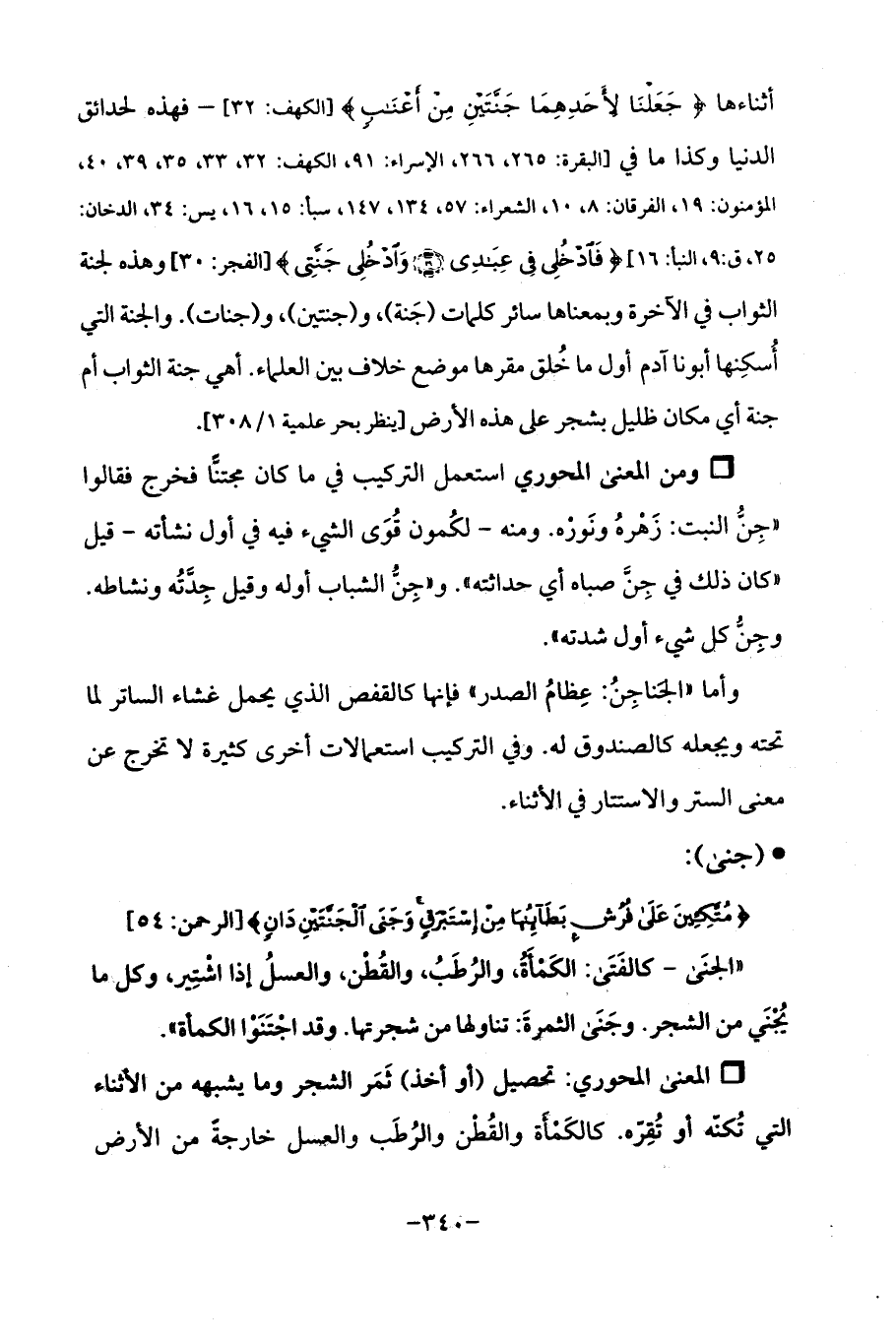 أثناءها {جَعَلْنَا لِأَحَدِهِمَا جَنَّتَيْنِ مِنْ أَعْنَابٍ} [الكهف: 32]- فهذه لحدائق الدنيا وكذا ما في [البقرة: 265، 266، الإسراء: 91، الكهف: 32, 33, 35، 39، 40، المؤمنون: 19، الفرقان: 8، 10، الشعراء: 57، 134، 147، سبأ: 15، 16، يس: 34، الدخان: 25، ق: 9، النبأ: 16] {فَادْخُلِي فِي عِبَادِي (29) وَادْخُلِي جَنَّتِي} [الفجر: 29، 30] وهذه لجنة الثواب في الآخرة وبمعناها سائر كلمات (جَنة)، و (جنتين)، و (جنات). والجنة التي أُسكِنها أبونا آدم أول ما خُلق مقرها موضح خلاف بين العلماء. أهي جنة الثواب أم جنة أي مكان ظليل بشجر على هذه الأرض [ينظر بحر علمية 1/ 308].