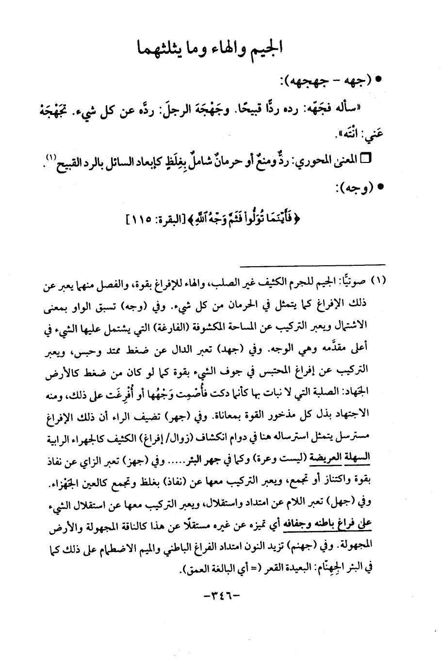 (¬1) صوتيًّا: الجيم للجرم الكثيف غير الصلب، والهاه للإفراغ بقوة، والفصل منهما يعبر عن ذلك الإفراغ كما يتمثل في الحرمان من كل شيء. وفي (وجه) تسبق الواو بمعنى الاشتمال ويعبر التركيب عن المساحة المكشوفة (الفارغة) التي يشتمل عليها الشيء في أعلى مقدَّمه وهي الوجه. وفي (جهد) تعبر الدال عن ضغط ممتد وحبس، ويعبر التركيب عن إفراغ المحتبس في جوف الشيء بقوة كما لو كان من ضغط كالأرض الجَهاد: الصلبة التي لا نبات بها كأنما دكت فأُصْمِت وَجْهُها أو أُفْرِغَت على ذلك، ومنه الاجتهاد بذل كل مذخور القوة بمعاناة. وفي (جهر) تضيف الراء ان ذلك الإفراغ مسترسل يتمثل استرساله هنا في دوام انكشاف (زوال/ إفراغ) الكثيف كالجهراء الرابية السهلة العريضة (ليست وعرة) وكما في جهر البئر ..... وفي (جهز) تعبر الزاي عن نفاذ بقوة واكتناز أو تجمع، ويعبر التركيب معها عن (نفاذ) بغلظ وتجمع كالعين الجَهْزاء. وفي (جهل) تعبر اللام عن امتداد واستقلال، ويعبر التركيب معها عن استقلال الشيء على فراغ باطنه وجفافه أي تميزه عن غيره مستقلًا عن هذا كالناقة المجهولة والأرض المجهولة. وفي (جهنم) تزيد النون امتداد الفراغ الباطني والميم الاضطمام على ذلك كما في البئر الجِهِنّام: البعيدة القعر (= أي البالغة العمق).