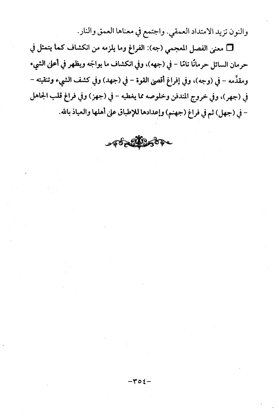 ° معنى الفصل المعجمي (جه): الفراغ وما يلزمه من انكشاف كما يتمثل في حرمان السائل حرمانًا تامًا -في (جهه)، وفي انكشاف ما يواجَه ويظهر في أعلى الشيء ومقدَّمه- في (وجه)، وفي إفراغ أقصى القوة -في (جهد) وفي كشف الشيء وتنقيته- في (جهر)، وفي خروج المندفن وخلوصه مما يغطيه -في (جهز) وفي فراغ قلب الجاهل- في (جهل) ثم في فراغ (جهنم) وإعدادها للإطباق على أهلها والعياذ بالله.