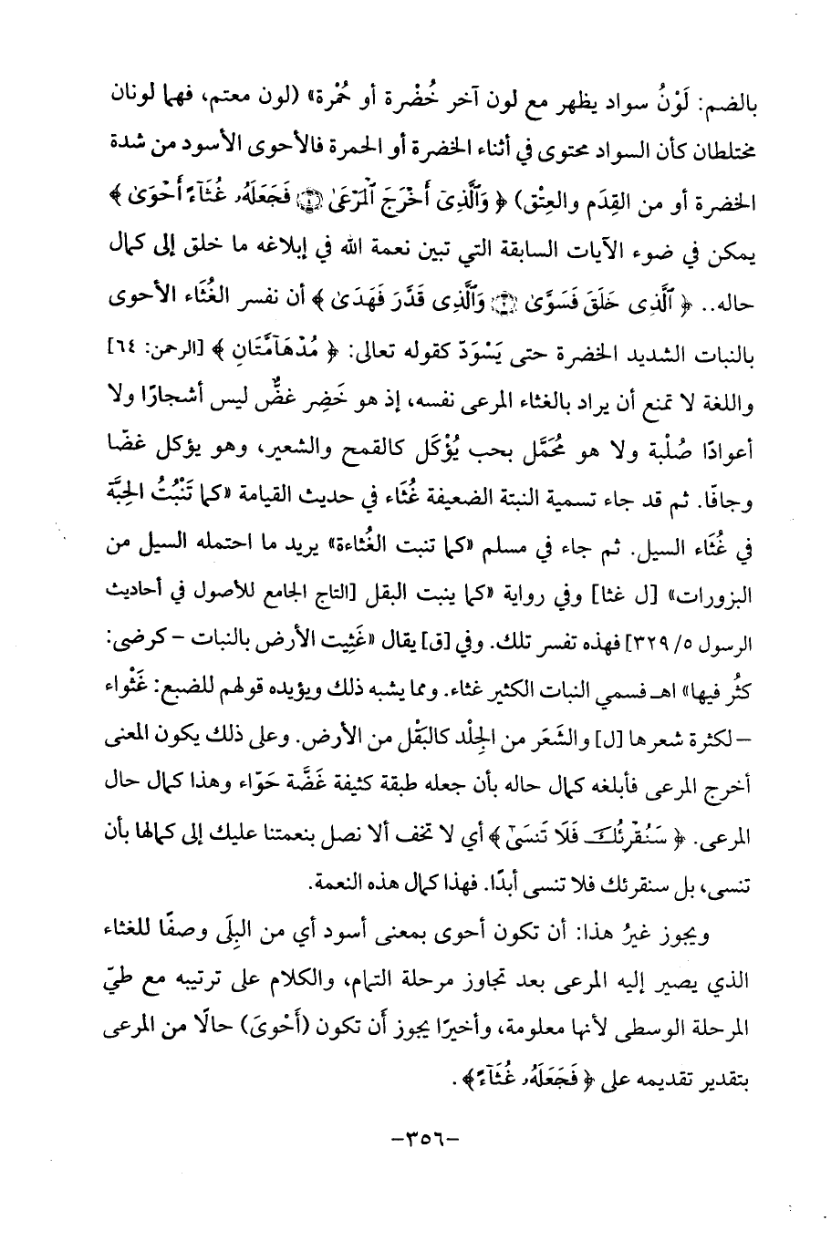 بالضم: لَوْنُ سواد بظهر مع لون آخر خُضْرة أو حُمْرة " (لون معتم، فهما لونان مختلطان كأن السواد محتوى في أثناء الخضرة أو الحمرة فالأحوى الأسود من شدة الخضرة أو من القِدَم والعِتْق) {وَالَّذِي أَخْرَجَ الْمَرْعَى (4) فَجَعَلَهُ غُثَاءً أَحْوَى} يمكن في ضوء الآيات السابقة التي تبين نعمة الله في إبلاغه ما خلق إلى كمال حاله .. {الَّذِي خَلَقَ فَسَوَّى (2) وَالَّذِي قَدَّرَ فَهَدَى} أن نفر الغُثَاء الأحوى بالنبات الشديد الخضرة حتى يَسْوَدّ قوله تعالى: {مُدْهَامَّتَانِ} [الرحمن: 64] واللغة لا تمنع أن يراد بالغثاء المرعى نفسه، إذ هو خَضِر غضٌّ ليس أشجارًا ولا أعوادًا صُلْبة ولا هو مُحَمَّل بحب يُؤْكَل كالقمح والشعير، وهو يؤكل غضًا وجافًا. ثم قد جاء تسمية النبتة الضعيفة غُثَاء في حديث القيامة "كما تَنْبُتُ الحِبَّة في غُثَاء السيل. ثم جاء في مسلم "كما تنبت الغُثاءة "يريد ما احتمله السيل من البزورات " [ل غثا] وفي رواية "كما ينبت البقل [التاج الجامع للأصول في أحاديث الرسول 5/ 329] فهذه تفسر تلك. وفي [ق] يقال "غَثِيت الأرض بالنبات -كرضى: كثُر فيها "اه فسمي النبات الكثير غثاء. ومما يشبه ذلك ويؤيده قولهم للضبع: غَثْواء- لكثرة شعرها [ل] والشَعَر من الجِلْد كالبَقْل من الأرض. وعلى ذلك يكون المعنى أخرج المرعى فأبلغه كمال حاله بأن جعله طبقة كثيفة غَضَّة حَوّاء وهذا كماله حال المرعى. {سَنُقْرِئُكَ فَلَا تَنْسَى (6)} أي لا تخف ألا نصل بنعمتا عليك إلى كمالها بأن تنسى بل سنقرئك فلا تنسى أبدًا. فهذا كمال هذه النعمة.