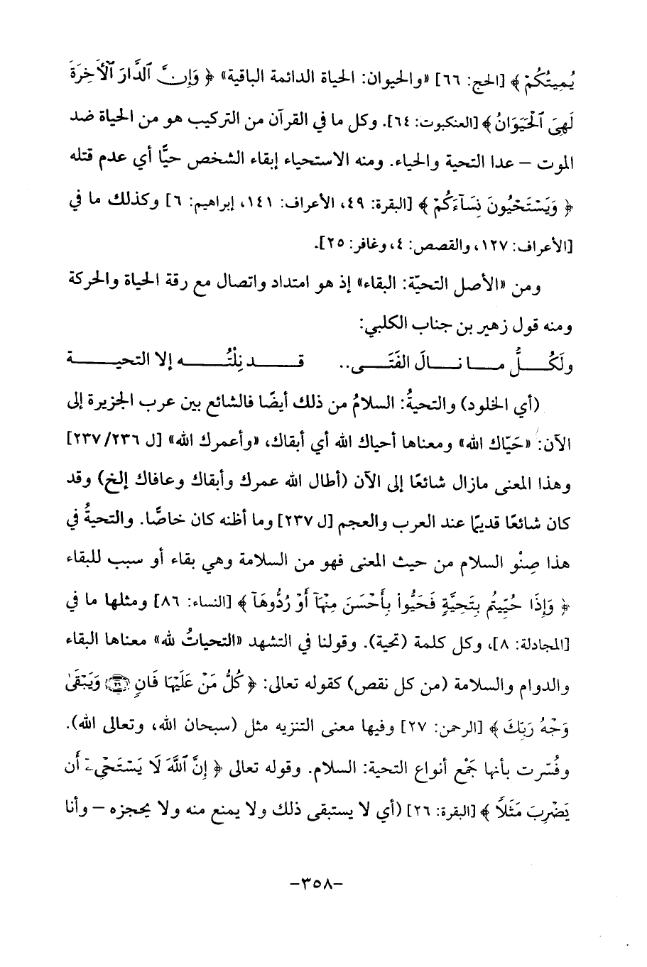 (أي الخلود) والتحيةُ: السلامُ من ذلك أيضًا فالشائع بين عرب الجزيرة إلى الآن: "حَيّاك الله "ومعناها أحياك الله أي أبقاك، "وأعمرك الله " [ل 236/ 237] وهذا المعنى مازال شائعًا إلى الآن (أطال الله عمرك وأبقاك وعافاك إلخ) وقد كان شائحًا قديمًا عند العرب والعجم [ل 237] وما أظنه كان خاصًّا. والتحيةُ في هذا صِنْو السلام من حيث المعنى فهو من السلامة وهي بقاء أو سبب للبقاء {وَإِذَا حُيِّيتُمْ بِتَحِيَّةٍ فَحَيُّوا بِأَحْسَنَ مِنْهَا أَوْ رُدُّوهَا} [النساء: 86] ومثلها ما في [المجادلة: 8]، وكل كلمة (تحية). وقولنا في التشهد "التحياتُ لله "معناها البقاء والدوام والسلامة (من كل نقص) كقوله تعالى: {كُلُّ مَنْ عَلَيْهَا فَانٍ (26) وَيَبْقَى وَجْهُ رَبِّكَ} [الرحمن: 27] وفيها معنى التنزيه مثل (سبحان الله، وتعالى الله). وفُسّرت بأنها جَمْع أنواع التحية: السلام. وقوله تعالى {إِنَّ اللَّهَ لَا يَسْتَحْيِي أَنْ يَضْرِبَ مَثَلًا} [البقرة: 26] (أي لا يستبقى ذلك ولا يمنع منه ولا يحجزه -وأنا