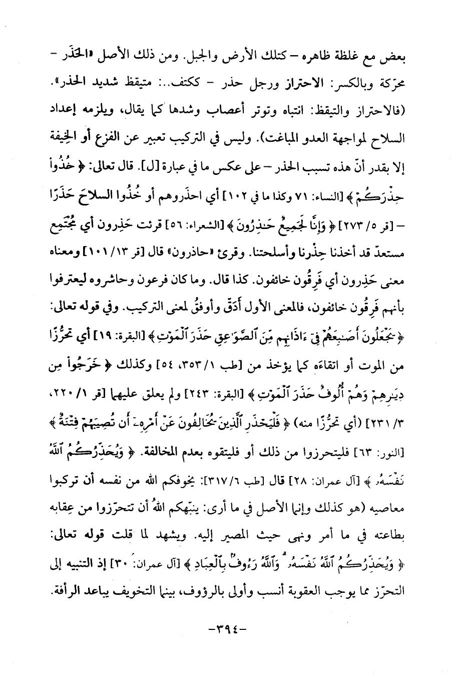 بعض مع غلظة ظاهره -كتلك الأرض والجبل. ومن ذلك الأصل "الحَذَر- محرّكة وبالكسر: الاحزاز ورجل حذر- ككتف .. : متيقظ شديد الحذر ". (فالاحتراز والتيقظ: انتباه وتوتر أعصاب وشدها كما يقال، ويلزمه إعداد السلاح لمواجهة العدو المباغت). وليس في التركيب تعبير عن الفزع أو الخِيفة إلا بقدر أنّ هذه تسبب الحذر -على عكس ما في عبارة [ل]. قال تعالى: {خُذُوا حِذْرَكُمْ} [النساء: 71 وكذا ما في 102] أي احذَروهم أو خُذُوا السلاحَ حَذَرًا -[قر 5/ 273] {وَإِنَّا لَجَمِيعٌ حَاذِرُونَ} [الشعراء: 56] قرئت حَذِرون أي مُجْتَمِع مستعدّ قد أخذنا حِذْرنا وأسلحتنا. وقرئ "حاذرون "قال [قر 13/ 101] ومعناه معنى حَذِرون أي فَرِقُون خائفون. كذا قال: وما كان فرعون وحاشروه ليعترفوا بأنهم فَرِقُوت خائفون، فالمعنى الأول أَدَقّ وأوفقُ لمعنى التركيب. وفي قوله تعالى: {يَجْعَلُونَ أَصَابِعَهُمْ فِي آذَانِهِمْ مِنَ الصَّوَاعِقِ حَذَرَ الْمَوْتِ} [البقرة: 19] أي تحرُّزًا من الموت أو اتقاءَه كما يؤخذ من [طب 1/ 353، 54] وكذلك ولم يعلق عليهما [قر 1/ 220، 3/ 231] (أي تحرُّزًا منه) {فَلْيَحْذَرِ الَّذِينَ يُخَالِفُونَ عَنْ أَمْرِهِ أَنْ تُصِيبَهُمْ فِتْنَةٌ} [النور: 63] فليتحرزوا من ذلك أو فليتقوه بعدم المخالفة. {وَيُحَذِّرُكُمُ اللَّهُ نَفْسَهُ} [آل عمران: 28] قال [طب 6/ 317]: يخوفكم الله من نفسه أن تركبوا معاصيه (هو كذلك وإنما الأصل في ما أرى: ينبّهكم اللهُ أن تتحرّزوا من عِقابه بطاعته في ما أمر ونهى حيث المصير إليه. ويشهد لما قلت قوله تعالى: {وَيُحَذِّرُكُمُ اللَّهُ نَفْسَهُ وَاللَّهُ رَءُوفٌ بِالْعِبَادِ} [آل عمران: 30] إذ التنبيه إلى التحرّز مما يوجب العقوبة أنسب وأولى بالرؤوف، بينما التخويف يباعد الرأفة.