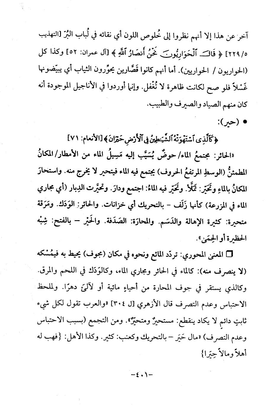 "الحائر: مجتمعُ الماء/ حوضٌ يُسَيَّب إليه مَسِيلُ الماء من الأمطار/ المكانُ المطمئنُّ (الوسطِ المرتفعُ الحروف) يجتمع فيه الماء فيتحير لا يخرج منه. واستحارَ المكانُ بالماءِ وتَحَير: تَمَلَّأ. وتَحَيّر فيه الماءُ: اجتمع ودارَ. وتحيَّرت الدِبار (أي مجاري الماء في المزرعة) كأنها زَلَف -بالتحريك أي خزانات. والحائر: الوَدَك. ومَرَقة متحيرة: كثيرة الإهالة والدَسَم. والمحارَة: الصَدَفة. والحير -بالفتح: شِبْه الحظيرة أو الحِمَى ".